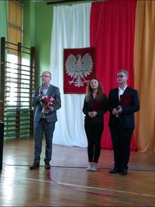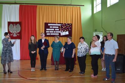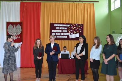 Pani Dyrektor Ewa Ziółkowska życzyła wszystkim nauczycielom i pracownikom szkoły wszelkiej pomyślności, wielu sukcesów oraz nieustającej satysfakcji z wykonywanej pracy. Następnie pogratulowała i wręczyła nagrody nauczycielom oraz pracownikom administracji i obsługi w uznaniu za ich zaangażowanie w pracę zawodową. Pan Bogdan Pawłowski – Burmistrz Kamieńska życzył wszystkim nauczycielom i pracownikom szkoły dużo zdrowia, radości oraz dalszych sukcesów zawodowych. W dalszej kolejności przedstawiciele uczniów klas pierwszych złożyli uroczyste przyrzeczenia, po których odbyła się część artystyczna akademii.