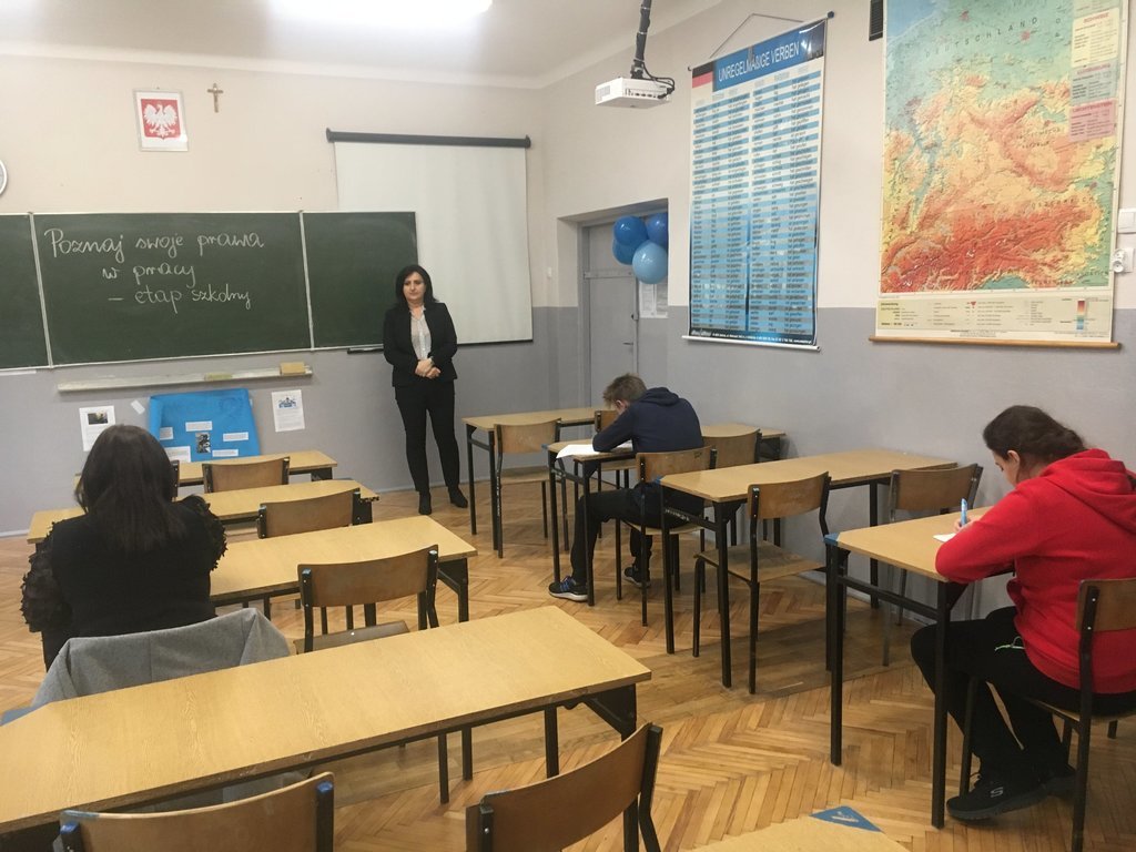 25 listopada odbył się szkolny etap konkursu „Poznaj swoje prawa w pracy”, organizowanego przez Państwową Inspekcję Pracy w ramach programu „Kultura bezpieczeństwa” pod honorowym patronatem Ministra Edukacji Narodowej. Koordynatorem programu była pani Barbara Tkacz. Do konkursu przystąpiło 6 uczniów: Marcelina Ziemba, Jakub Krupa, Marcel Tokarski, Piotr Dworzyński, Anita Blada oraz Magda Biegańska. Test zawierał 25 pytań m.in. z dziedziny prawa pracy, bezpieczeństwa i higieny pracy, ergonomii.