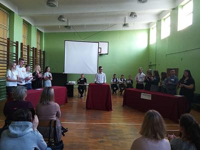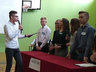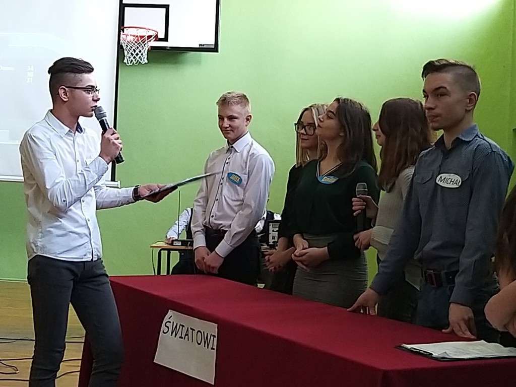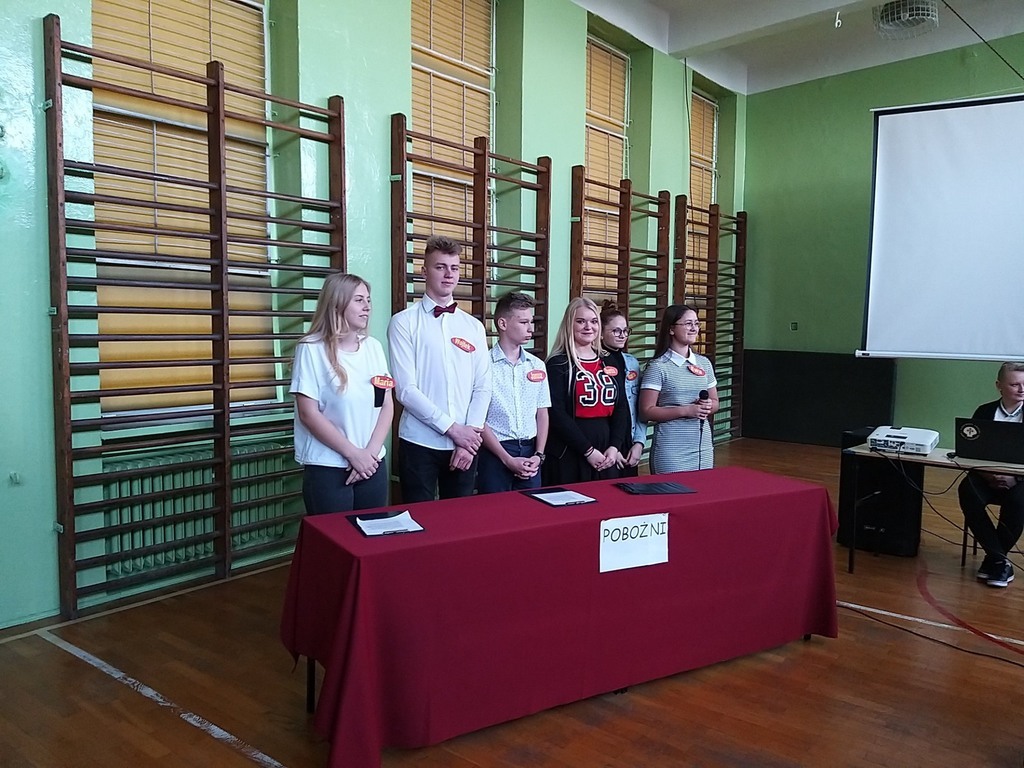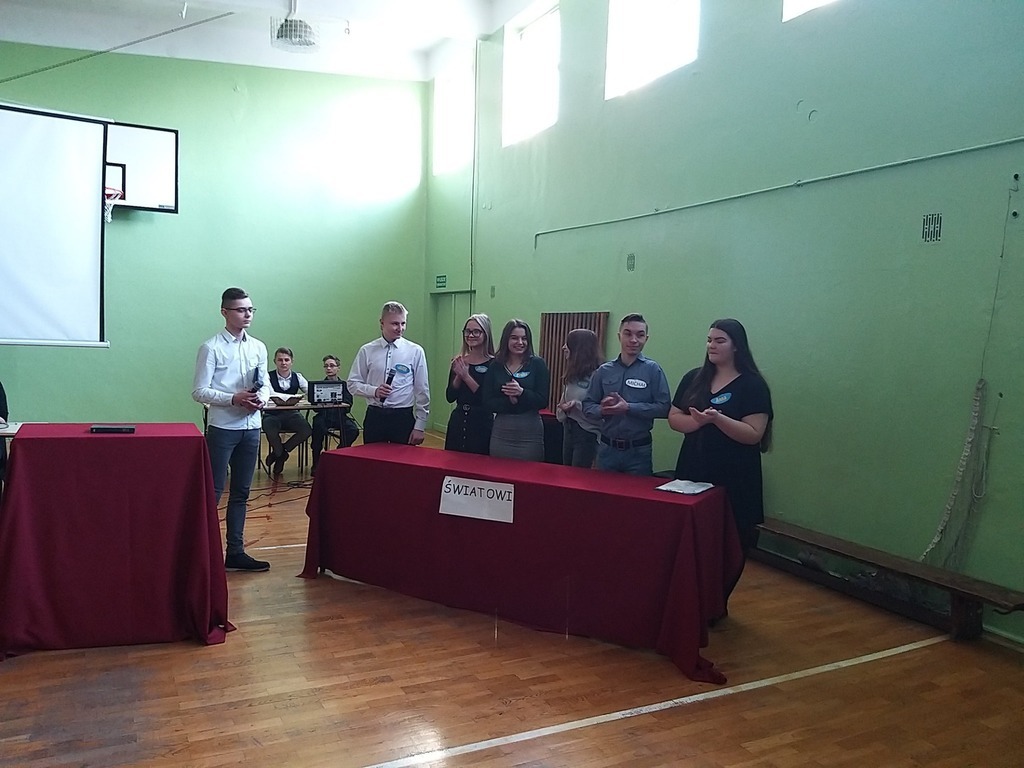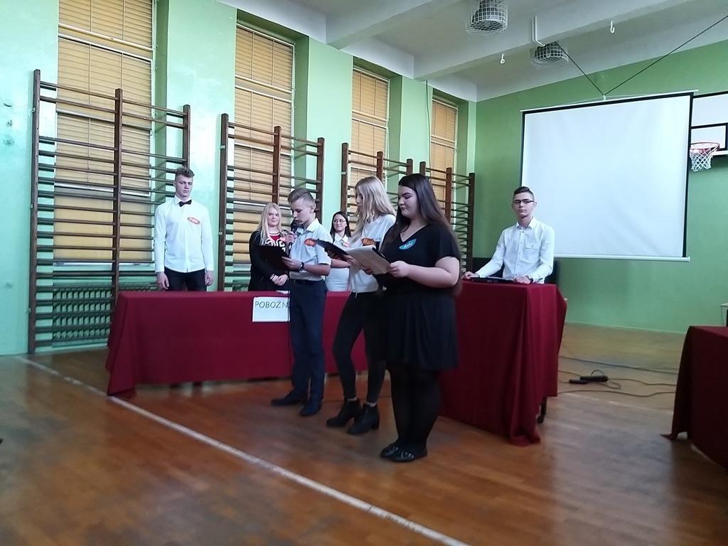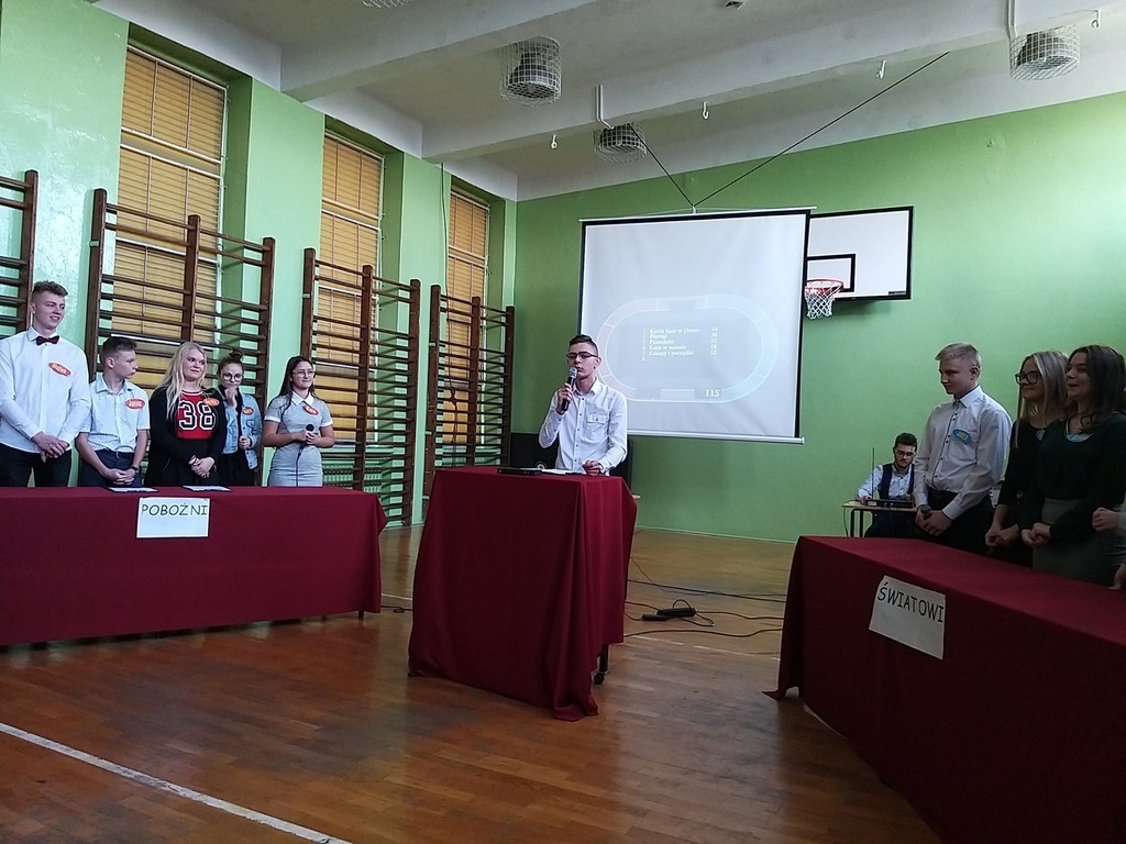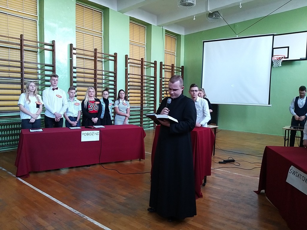 W świąteczną atmosferę wprowadziła nas młodzież, która pod kierunkiem ks. Michała Sokalskiego przygotowała Jasełka będące piękną tradycją Świąt Bożego Narodzenia. W tym roku rozegrano świąteczną Familiadę, w której pytania dotyczyły np. potraw wigilijnych i zwyczajów świątecznych. Na zakończenie przedstawienia Pani Dyrektor Ewa Ziółkowska złożyła wszystkim życzenia świąteczne i symbolicznie cała społeczność szkolna połamała się opłatkiem.