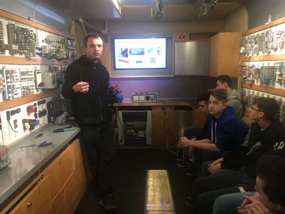W dn. 4 marca br. uczniowie klas zawodowych (technikum i branżowej szkoły I stopnia) mieli możliwość uczestniczenia w zajęciach w mobilnym laboratorium. Podczas nich przeprowadzali doświadczenia pokazujące zachowanie złączek w ekstremalnych warunkach, takich jak wystąpienie zwarcia w instalacji elektrycznej bądź narażenie na drgania o zmiennych częstotliwościach.