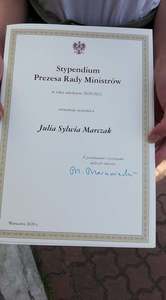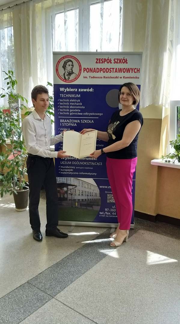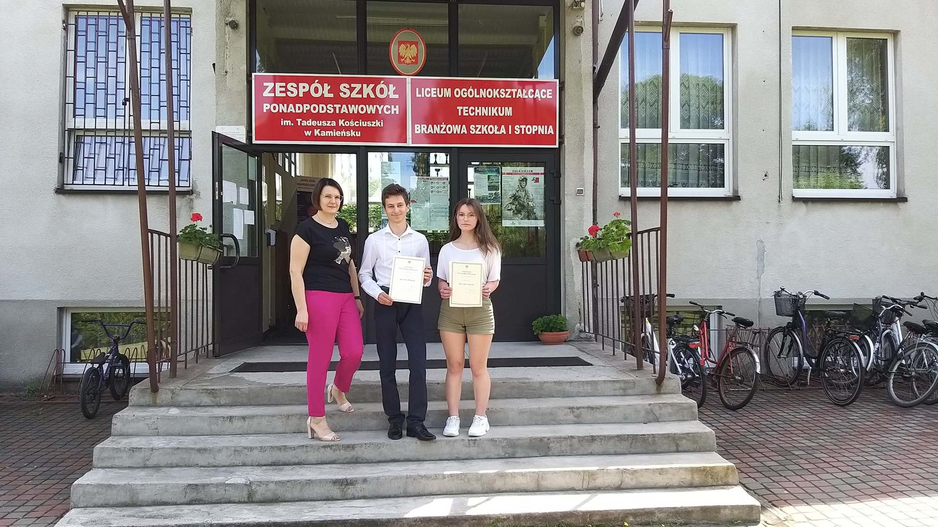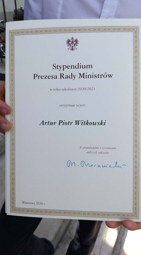 Jest nam niezmiernie miło poinformować, że Julia Marczak – uczennica klasy II liceum oraz Artur Witkowski – uczeń klasy II technikum, odebrali z rąk Pani Dyrektor Ewy Ziółkowskiej dyplomy gratulacyjne Prezesa Rady Ministrów za najlepsze wyniki w nauce w roku szkolnym 2019/2020. Stypendium Prezesa Rady Ministrów przyznawane jest uczniom, którzy otrzymali promocję z wyróżnieniem, uzyskując najwyższą średnią ocen w szkole.