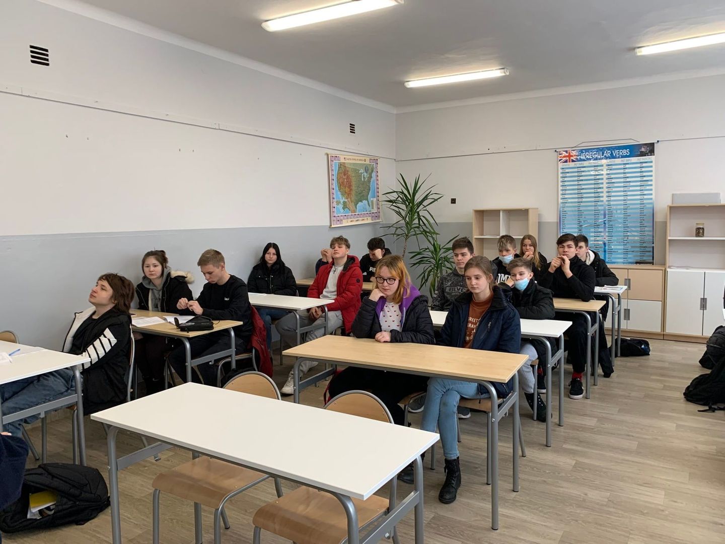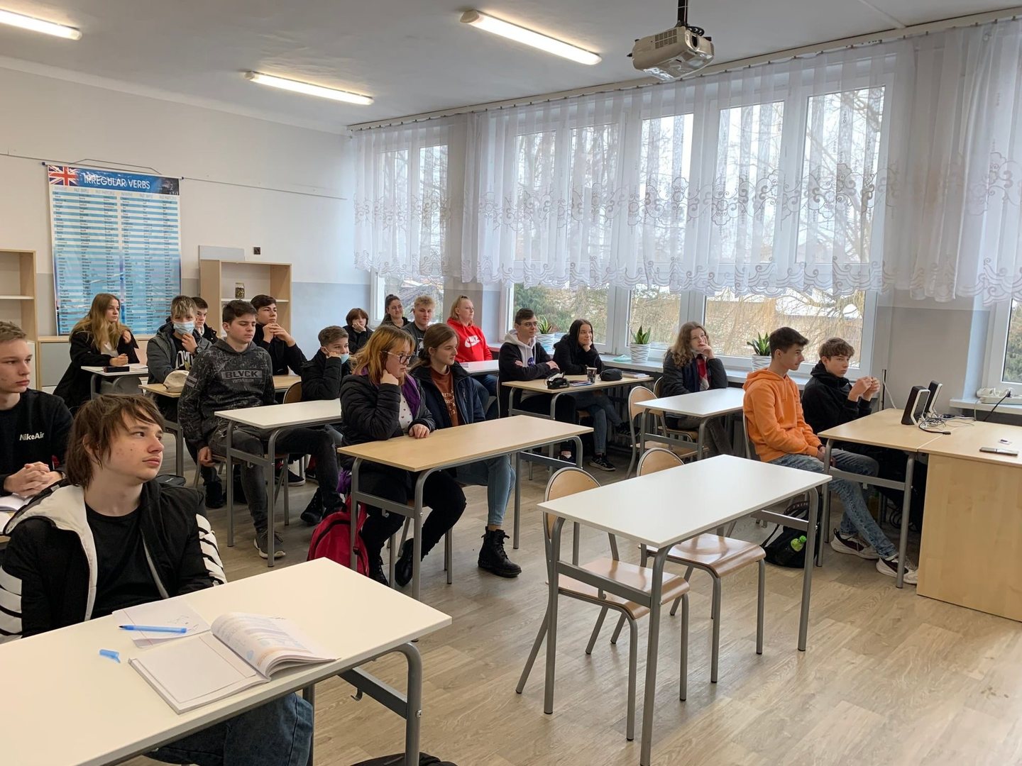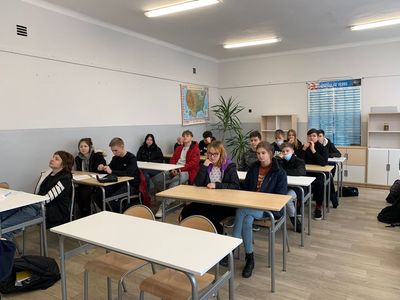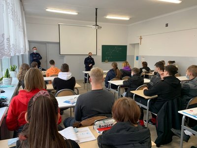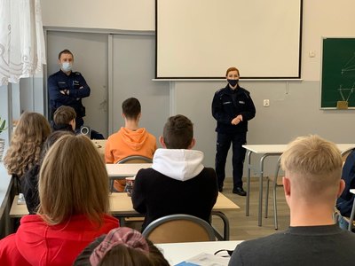W poniedziałek 24 stycznia 2022 roku uczniowie klas pierwszej i trzeciej LO uczestniczyli w spotkaniu z przedstawicielką Komendy Powiatowej Policji w Radomsku mł. asp. Agnieszką Kropisz i panem dzielnicowym z Komisariatu Policji w Kamieńsku mł. asp. Rafałem Rudnickim.