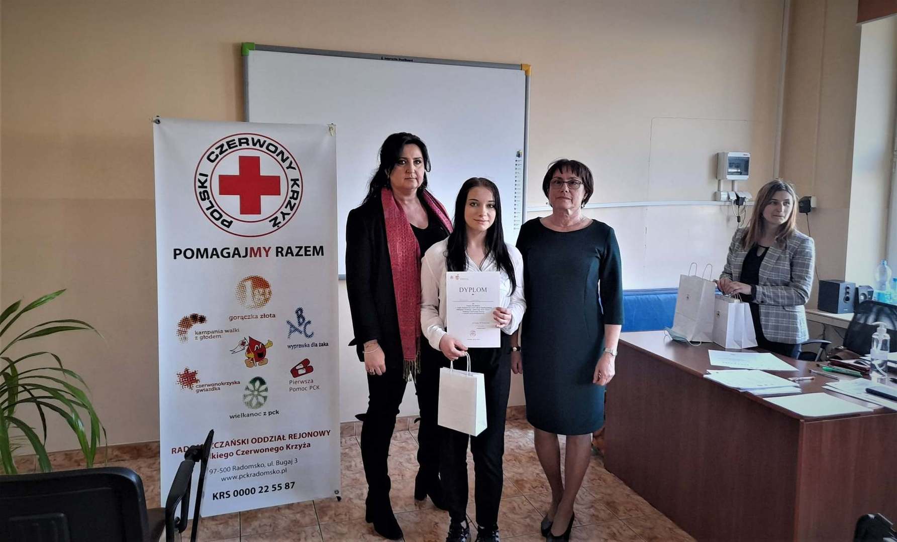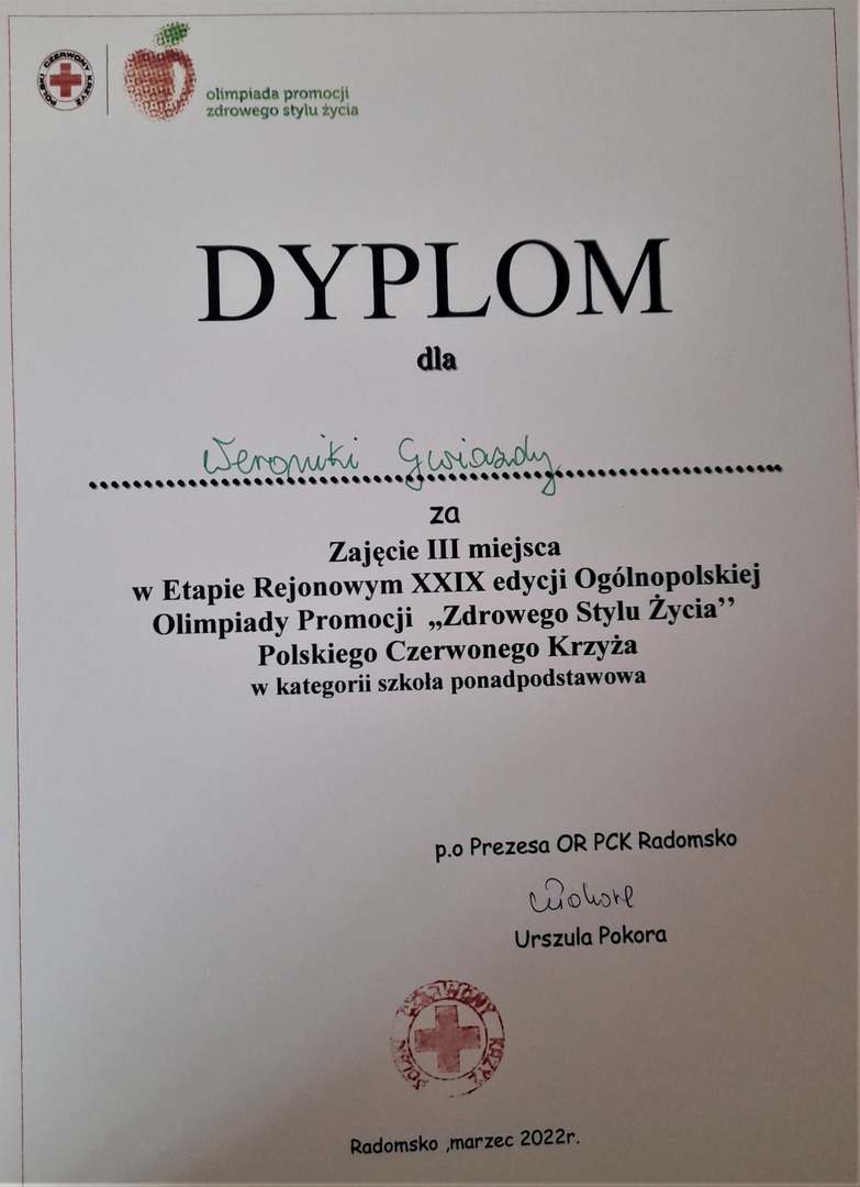 03 marca 2022 r. w PSP nr 4 w Radomsku odbył się etap rejonowy XXIX Ogólnopolskiej Olimpiady Promocji Zdrowego Stylu Życia PCK. Młodzież miała za zadanie rozwiązać test jednokrotnego wyboru składający się z 30 pytań. Naszą szkołę reprezentowała Weronika Gwiazda, która zajęła III miejsce w kategorii szkół ponadpodstawowych. Gratulujemy !!!