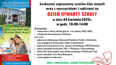 ZAPRASZAMY NA DZIEŃ OTWARTY SZKOŁY!!! 😍😍😍 Zdjęcia Zobacz również PAKIET DYDAKTYCZNY DLA KLAS MUNDUROWYCH 💪💪💪 WIOSENNY TURNIEJ PIŁKI SIATKOWEJ 🏐🌼🏐🌼🏐 TADEUSZ KOŚCIUSZKO – PATRON NASZEJ SZKOŁY 😊😊😊 ZAPRASZAMY NA DZIEŃ OTWARTY SZKOŁY!!! 😍😍😍 MŁODZI NA RYNKU PRACY 😃😃😃 DZIEŃ OTWARTY SZKOŁY 2022🥳🥳🥳🥳🥳 28 marca 2022 Aktualności Wydrukuj Udostępnij Wyświetlono: 667
