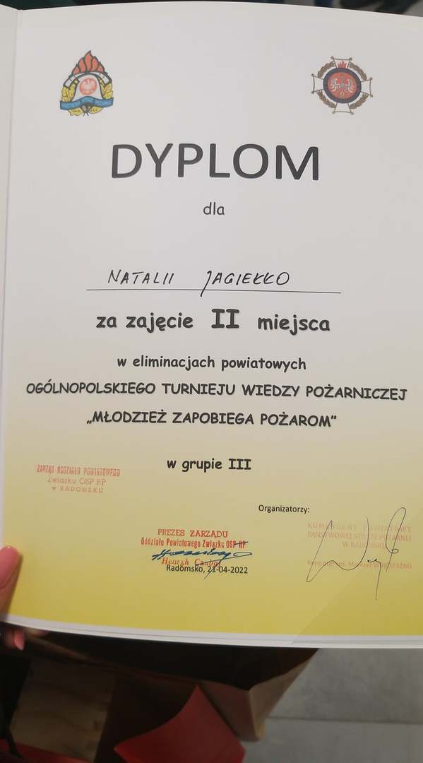 W dniu 21.04.2022r., w Komendzie Powiatowej Państwowej Straży Pożarnej w Radomsku odbył się Powiatowy Turniej Wiedzy Pożarniczej „Młodzież zapobiega pożarom”. Naszą szkołę reprezentowała Natalia Jagiełło z klasy III LOsp, która zajęła II miejsce w grupie szkół średnich. Jesteśmy dumni i serdecznie gratulujemy!!!