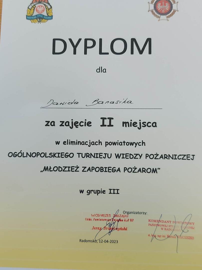 W dniu 12.04.2023r., w Komendzie Powiatowej Państwowej Straży Pożarnej w Radomsku odbył się Powiatowy Turniej Wiedzy Pożarniczej „Młodzież zapobiega pożarom”. Naszą szkołę reprezentował Dawid Banasik z klasy III technikum, który zajął II miejsce w grupie szkół średnich. Jesteśmy dumni i serdecznie gratulujemy!!! 👏👏👏