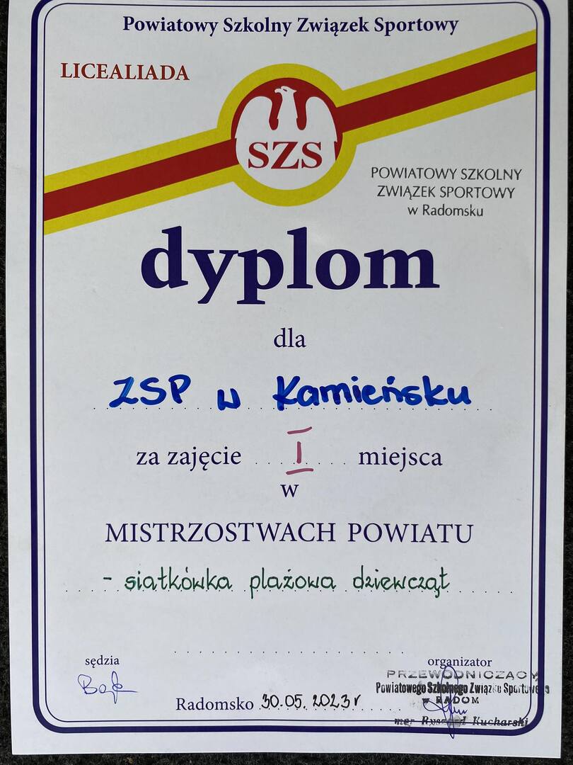 W dniach 30-31.05.2023r. rozegrano Mistrzostwa Powiatu w Siatkówkę Plażową Dziewcząt i Chłopców. Naszą szkołę reprezentowali: Hubert Wawszczak z klasy III LO oraz Łukasz Pawlikowski z klasy III T. Chłopcy zajęli I miejsce. Drużynę dziewcząt reprezentowały: Nicola Wawszczak z klasy II LO oraz Natalia Siewier z klasy III LO. Dziewczyny również zajęły I miejsce. Jesteśmy dumni i serdecznie gratulujemy!!! 👏👏👏