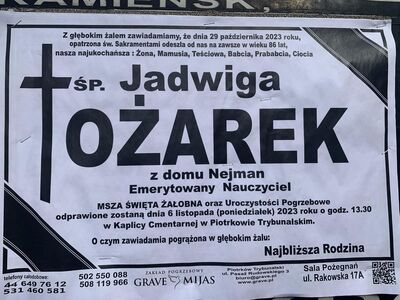 ŚP. PANI PROFESOR JADWIGA OŻAREK Z głębokim żalem żegnamy śp. JADWIGĘ OŻAREK, wieloletniego nauczyciela i wychowawcę Internatu naszej szkoły. Rodzinie Zmarłej składamy wyrazy głębokiego współczucia. Zdjęcia Zobacz również KONKURS WIEDZY HIV/AIDS i STD 💉🩸🩺 WYCIECZKA DO KOPALNI WĘGLA BRUNATNEGO I ELEKTROWNI... HALLOWEEN 🎃🎃🎃 ŚP. PANI PROFESOR JADWIGA OŻAREK SPOTKANIE Z ŻOŁNIERZEM 🙂🙂🙂 TURNIEJ SZACHOWY ♟♟♟ 04 listopada 2023 Aktualności Wydrukuj Udostępnij Wyświetlono: 153
