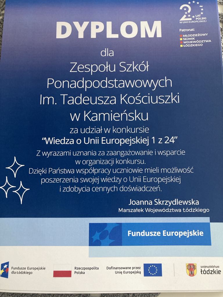 W dniu 18 czerwca 2024 r. uczniowie klas II LO i III LO wzięli udział w finale konkursu „Wiedzy o Unii Europejskiej 1 z 24”, który odbył się w Łodzi w Teatrze im. S. Jaracza. W ostatnim etapie, czyli finale reprezentowali nas: Dominik Gałwa, Karolina Krupa i Natalia Skura. Wszyscy uczestnicy otrzymali upominki i dyplomy. Zajęliśmy VI miejsce wśród 11 szkół, które brały udział w konkursie. 👏👏👏👏👏