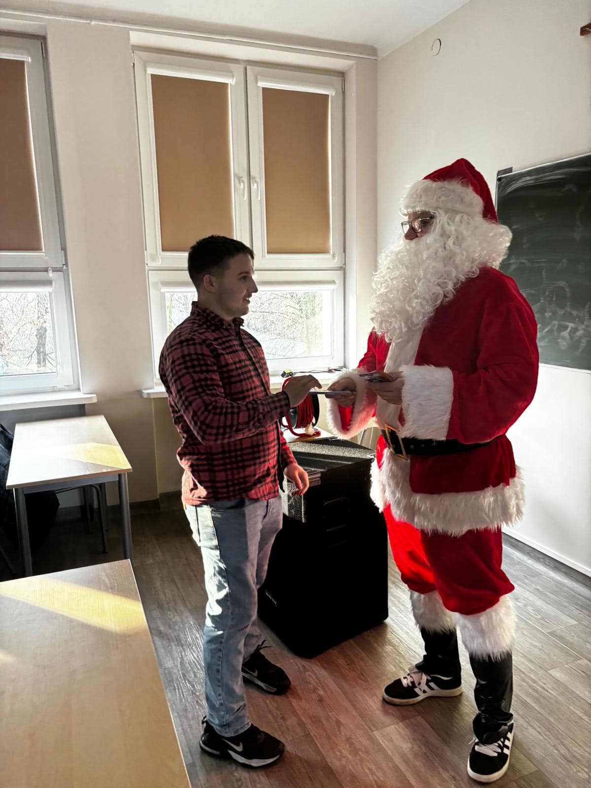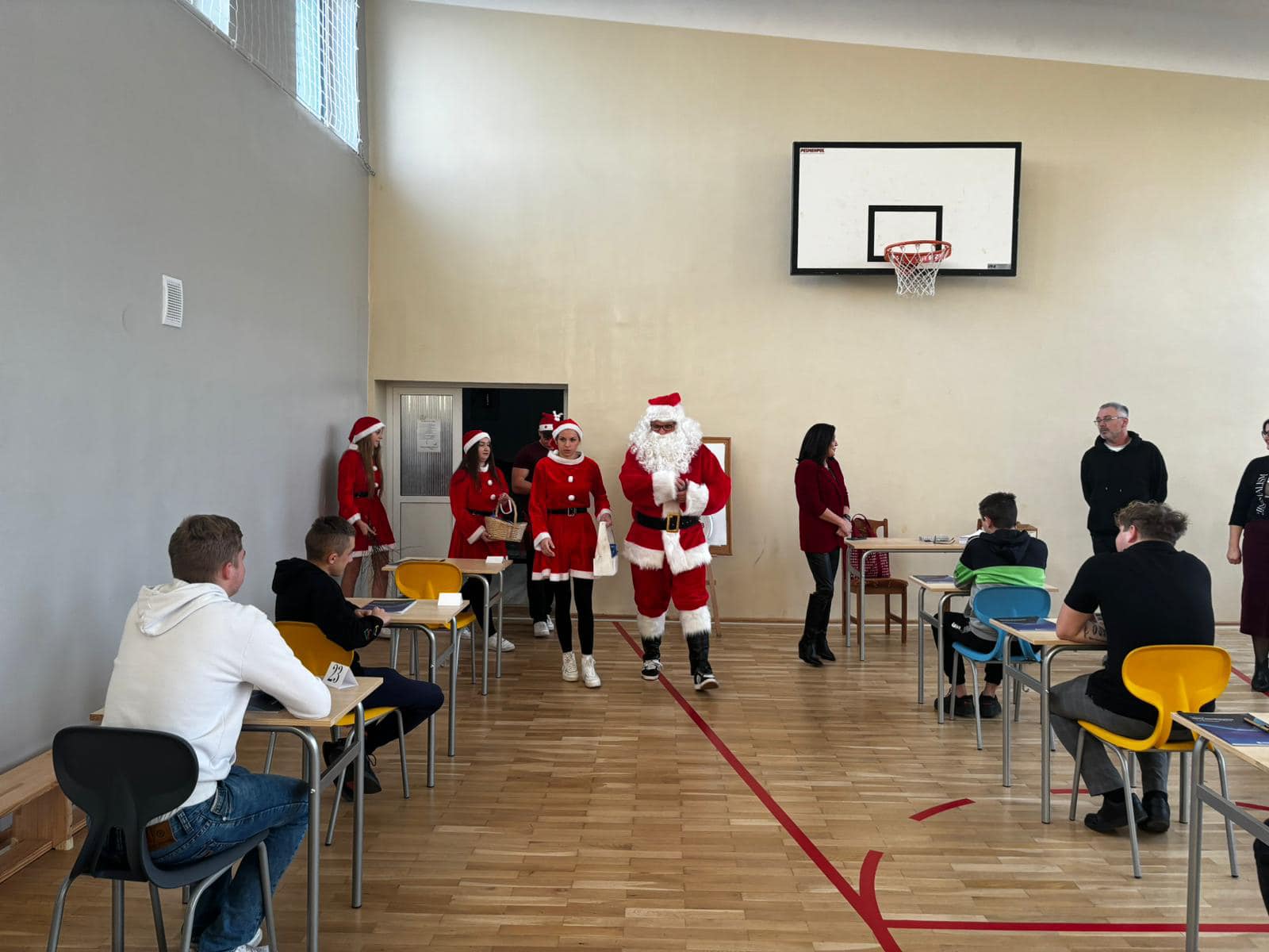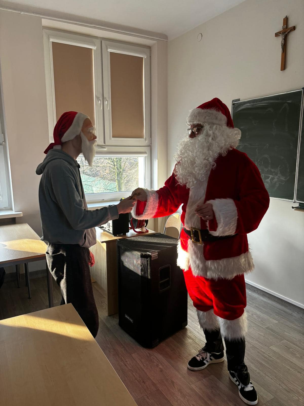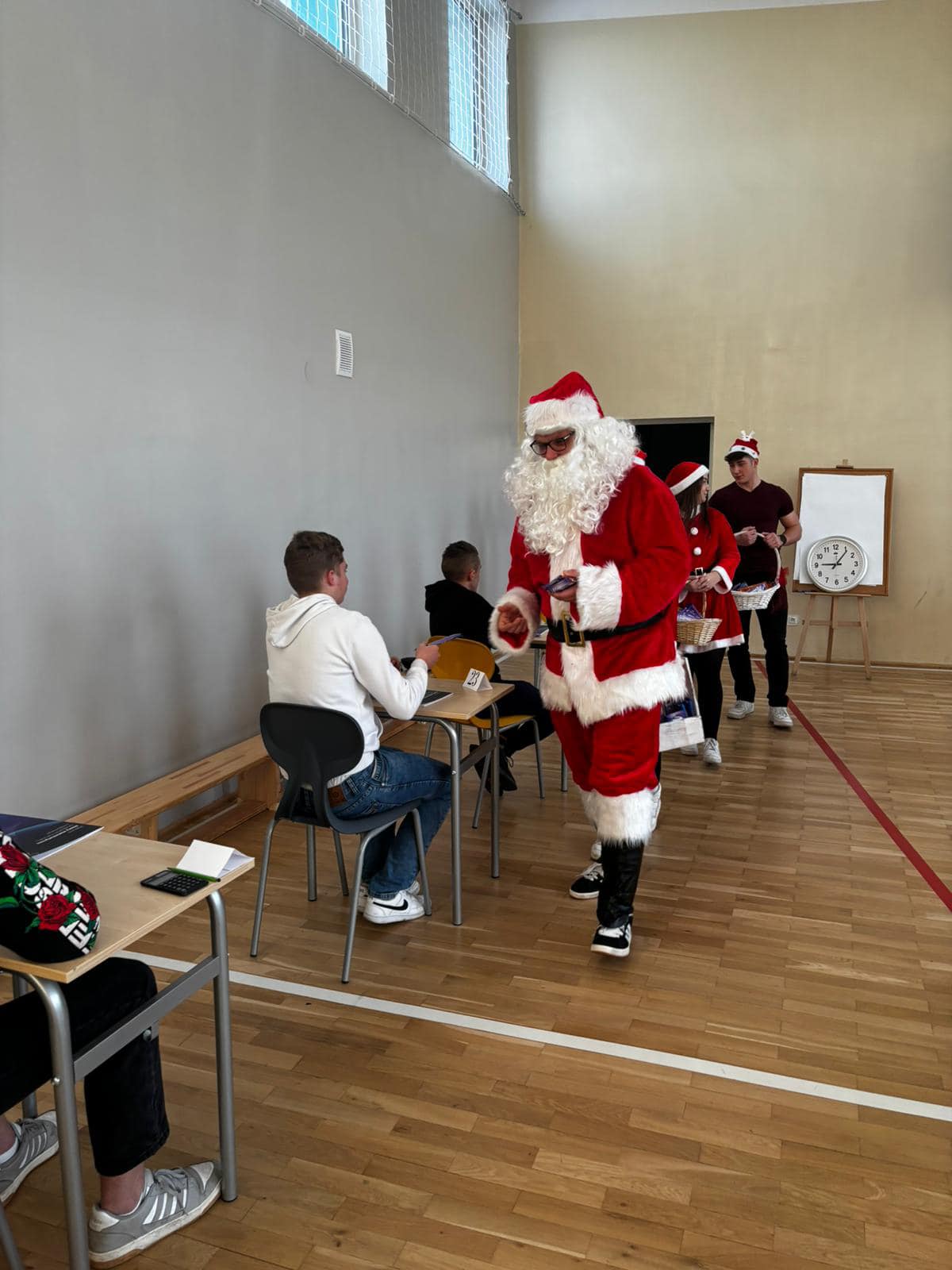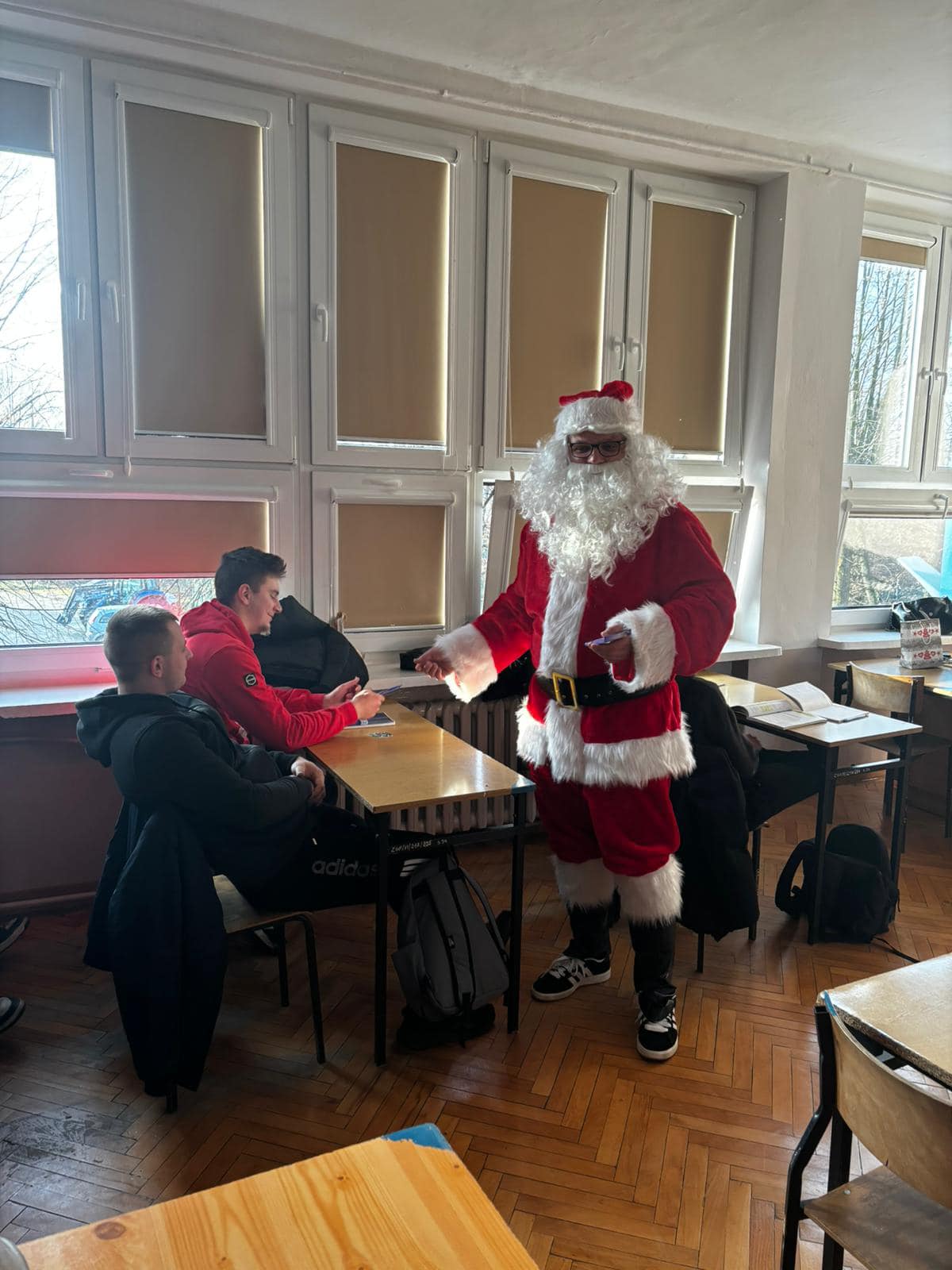 Nie zabrakło radości, uśmiechów i wspólnej integracji całej społeczności szkolnej. 🎉 Nawet maturzyści, mimo że zmagali się z próbną maturą z matematyki, zostali odwiedzeni przez Mikołaja – w końcu świąteczna magia jest dla każdego! 🎁