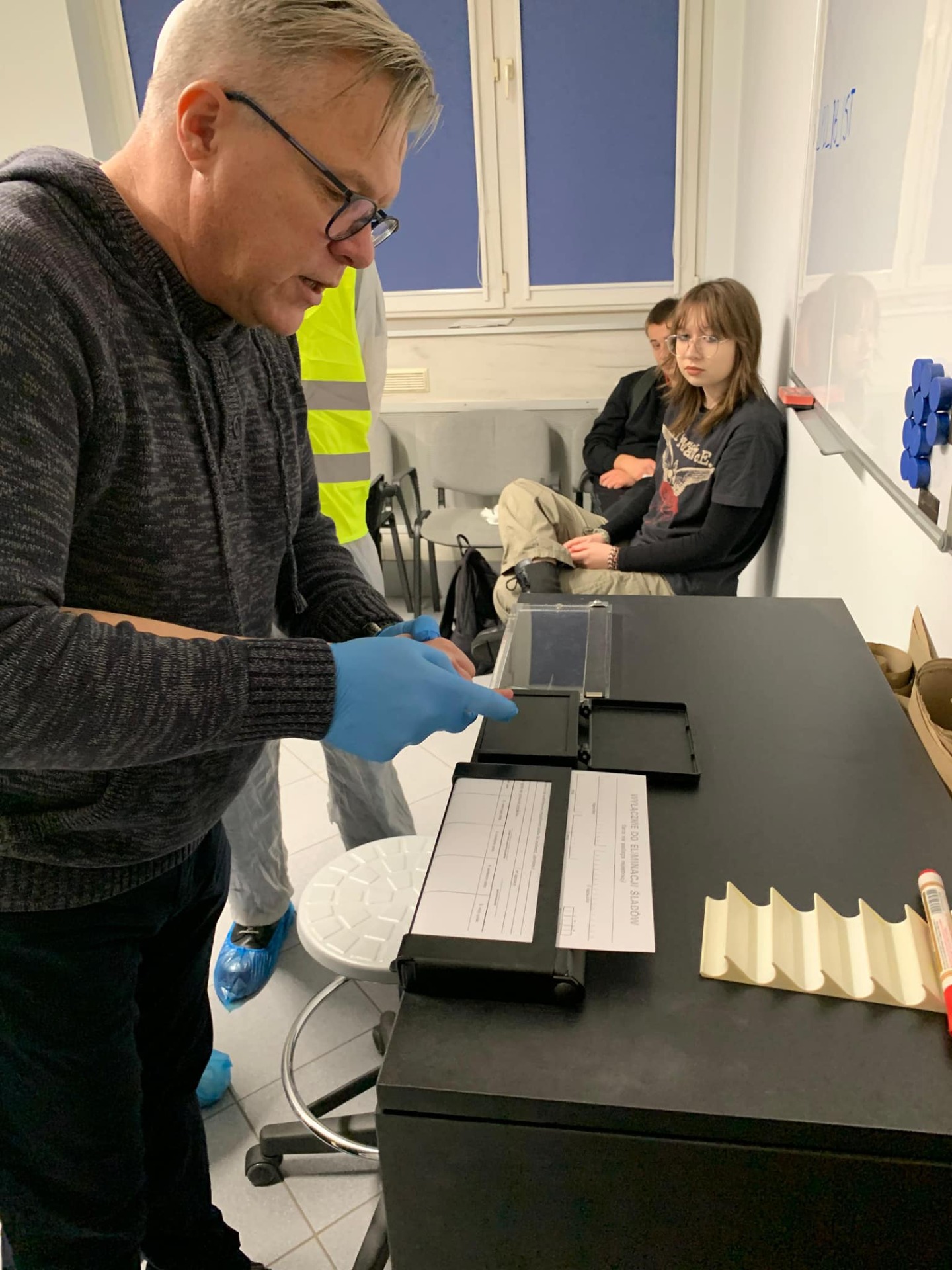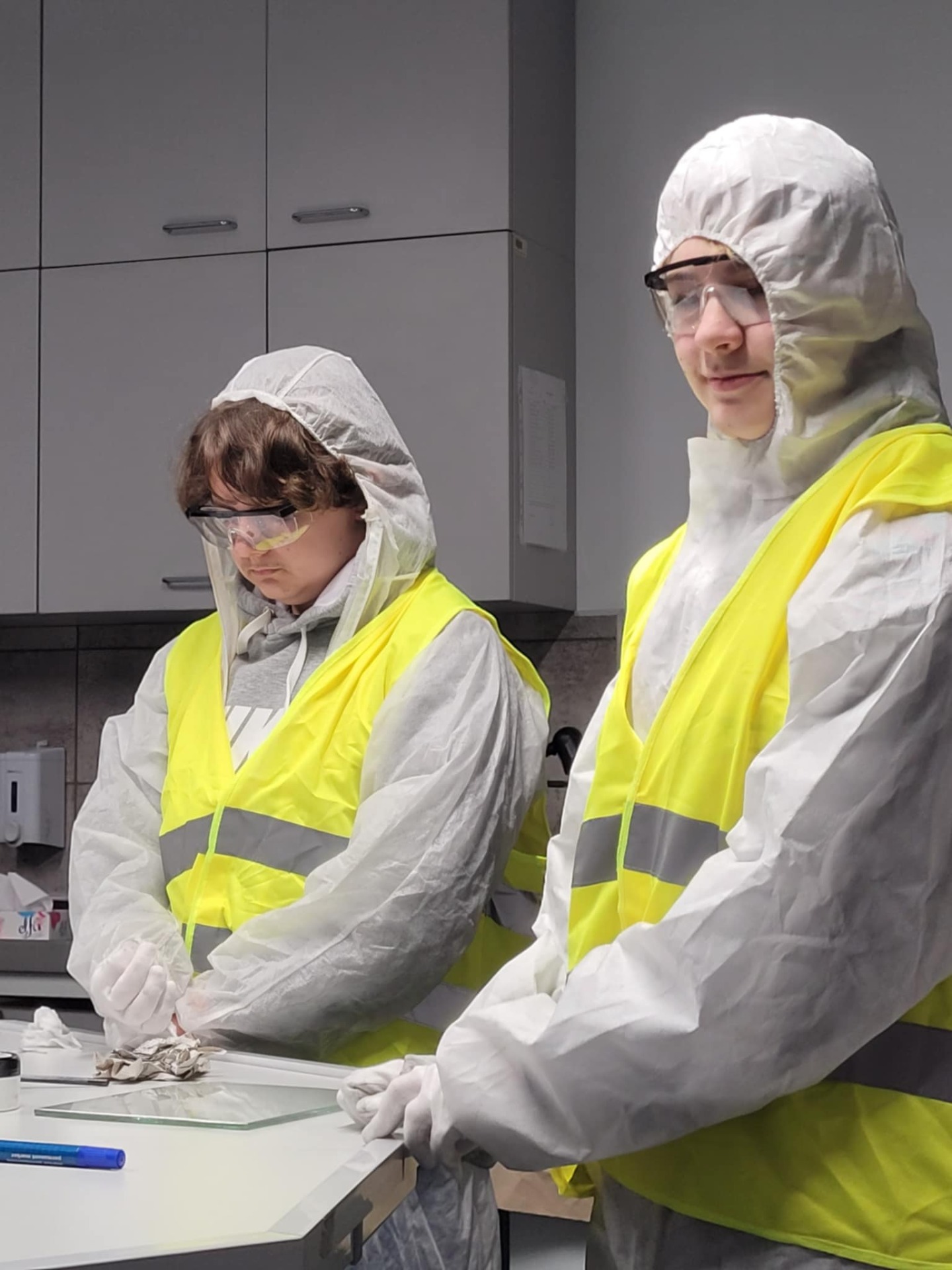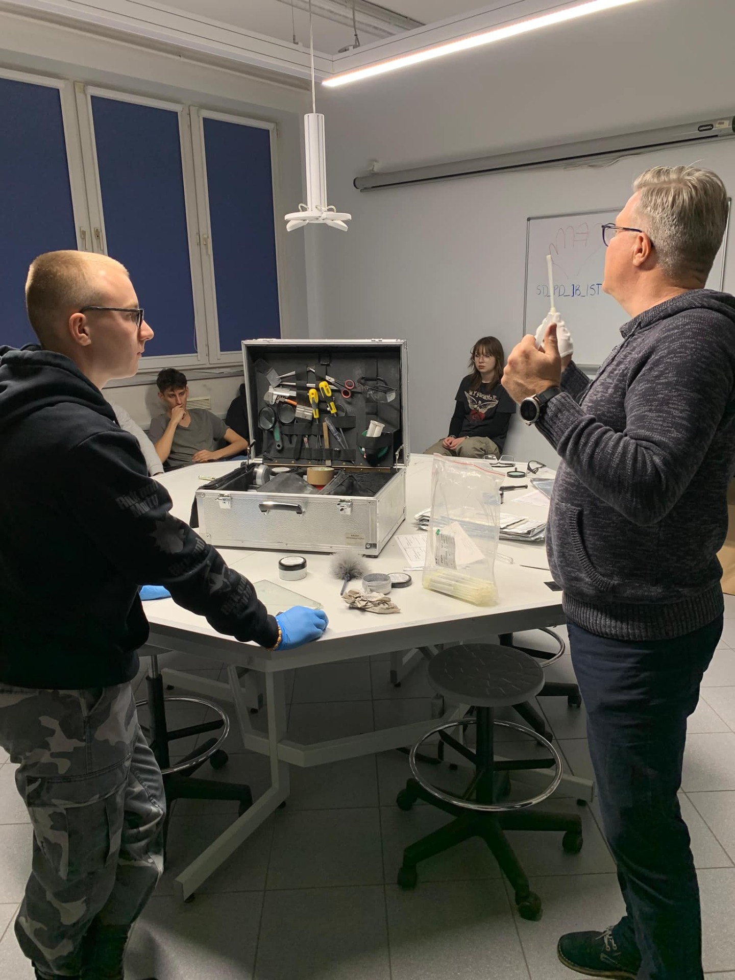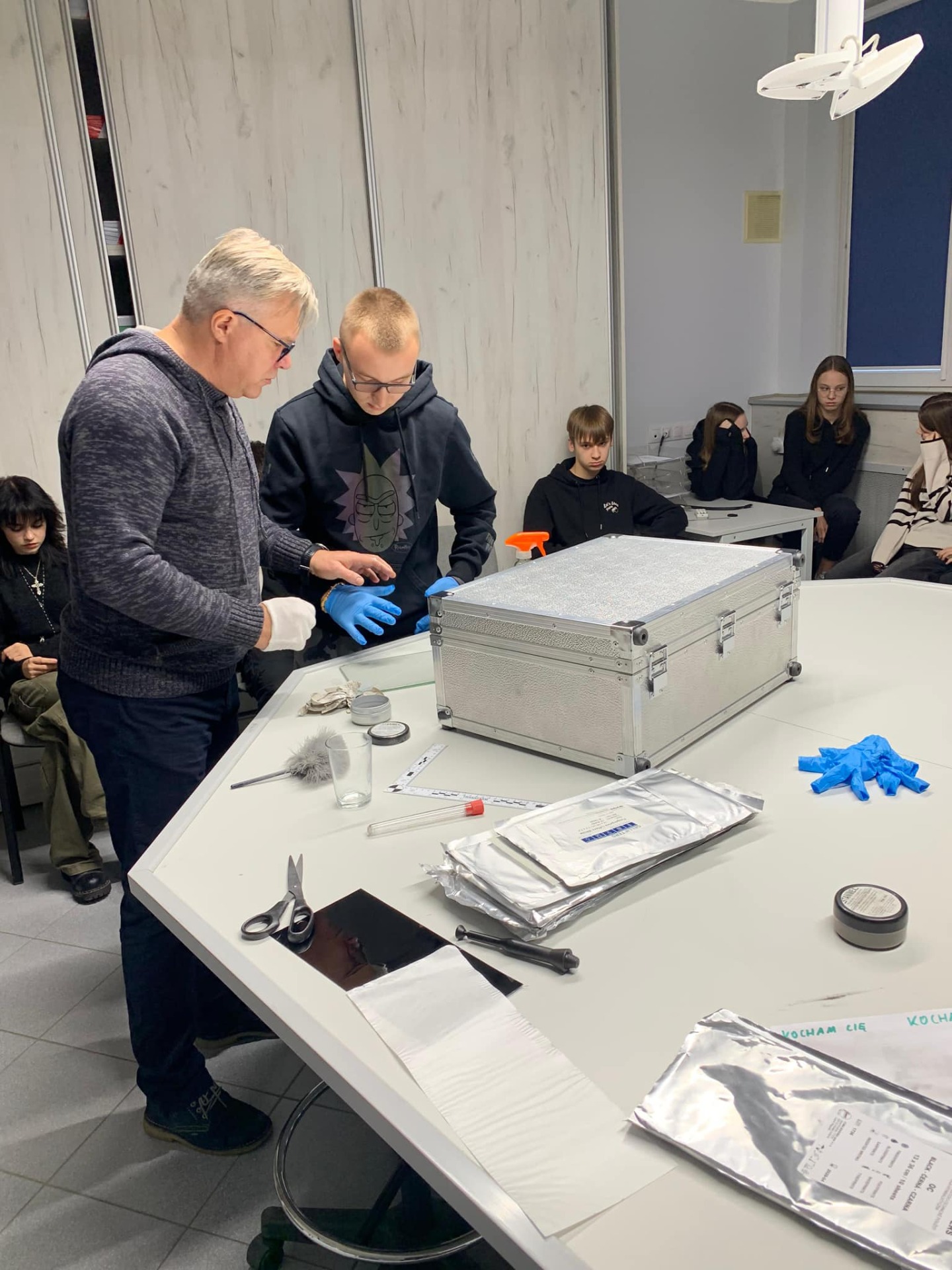 🔎dr Jacek Copik przeprowadził zajęcia w pracowni kryminalistycznej, podczas których pokazał uczniom jak zabezpieczać ślady na miejscu zbrodni.