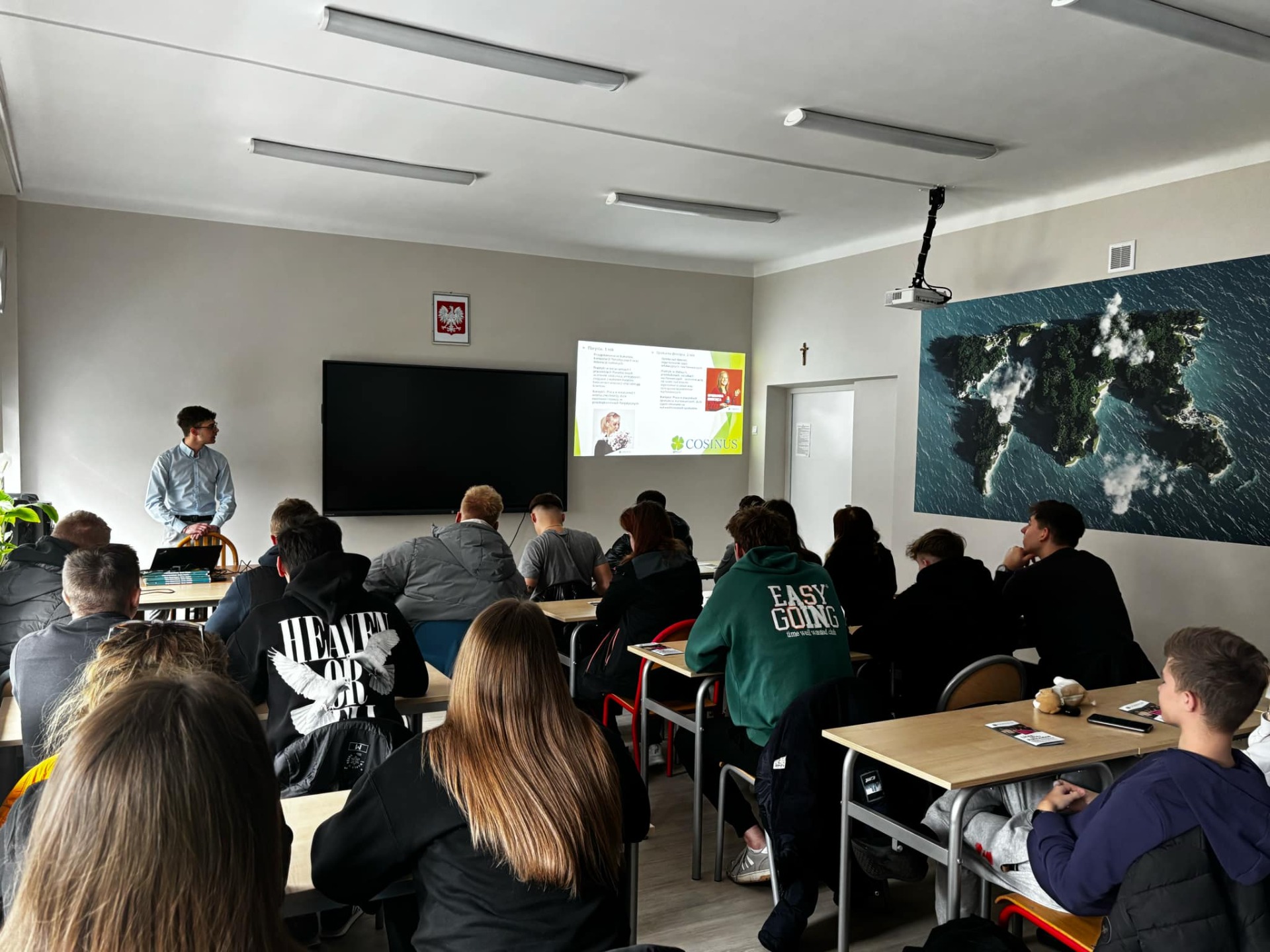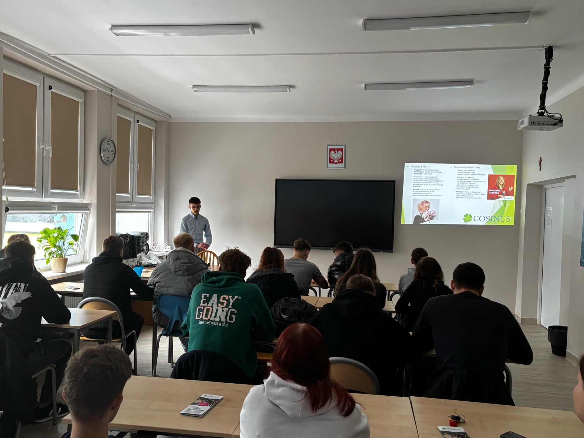 W dniu 14 marca 2025 r. odbyło się spotkanie klas maturalnych z przedstawicielem szkoły policealnej "COSINUS" z Bełchatowa. W trakcie spotkania uczniowie mieli okazję zapoznać się z różnorodnymi kierunkami kształcenia, które szkoła oferuje, w tym kursami zawodowymi, które otwierają drzwi do wielu zawodów w przyszłości. 🧑🏫