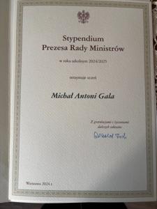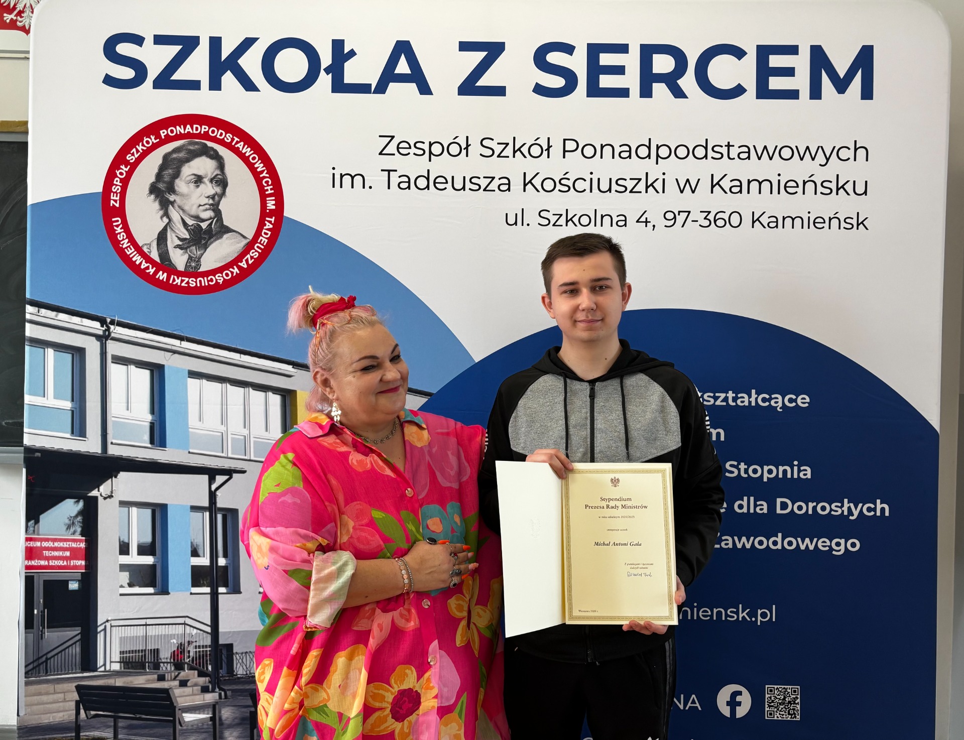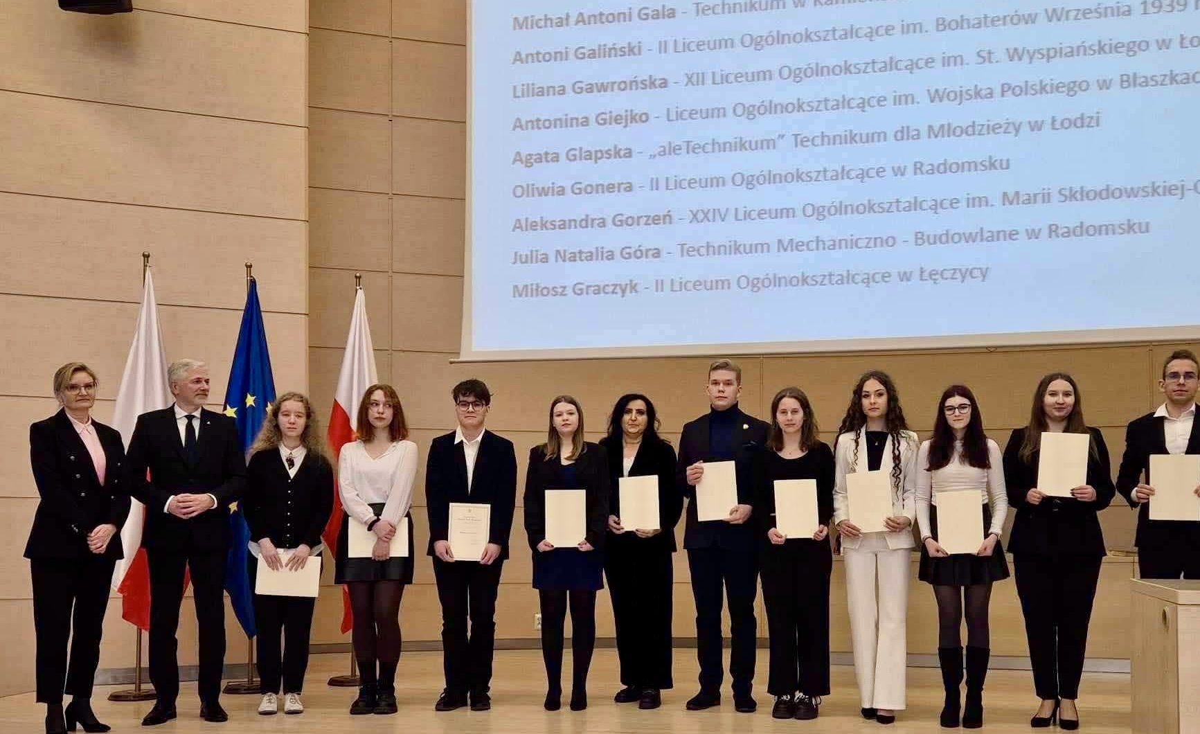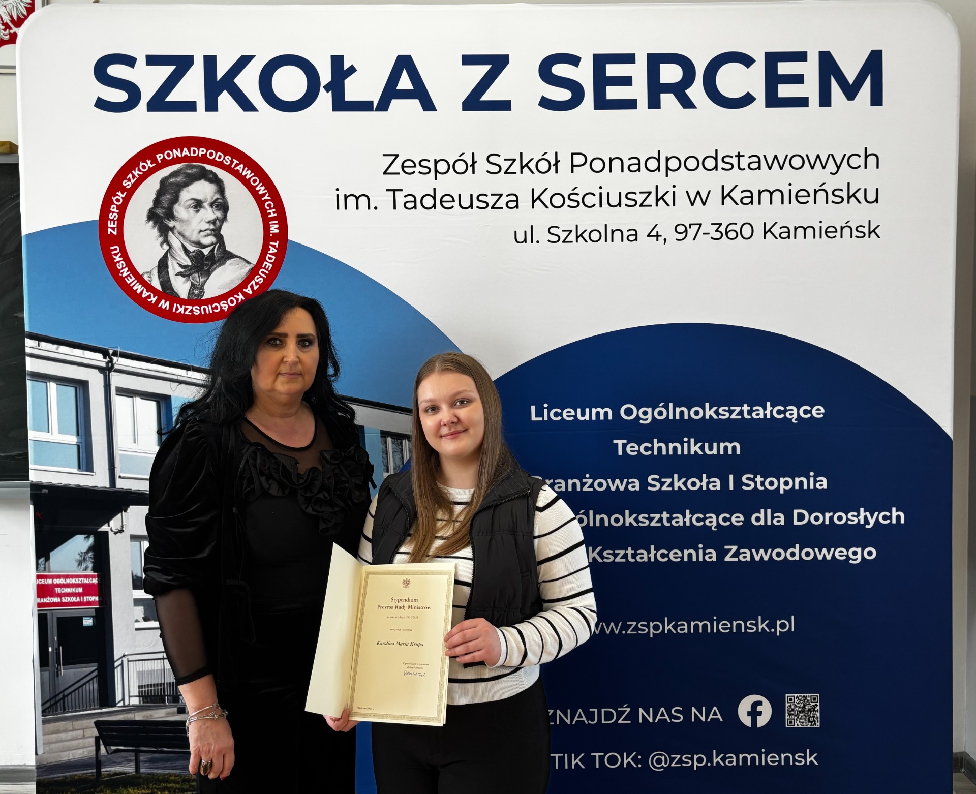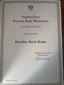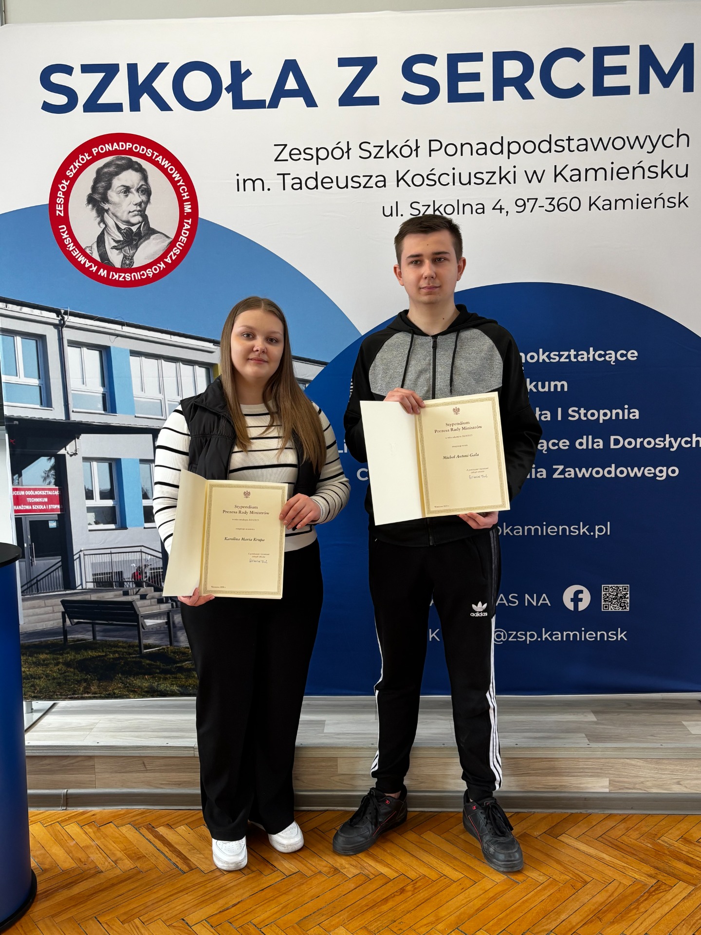 Karolina Krupa uczennica IV klasy liceum oraz Michał Gala uczeń V klasy technikum w Zespole Szkół Ponadpodstawowych im. Tadeusza Kościuszki w Kamieńsku zostali laureatami Stypendium Prezesa Rady Ministrów. To wyróżnienie jest dowodem ich ciężkiej pracy, zaangażowania i wyjątkowych osiągnięć w nauce. Podczas uroczystej gali, która odbyła się 17 marca 2025 roku w Auli Czerwonej Wydziału Prawa i Administracji Uniwersytetu Łódzkiego, stypendystom zostały wręczone dyplomy potwierdzające ich wybitne wyniki.