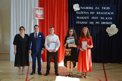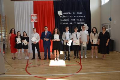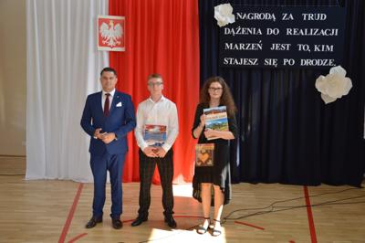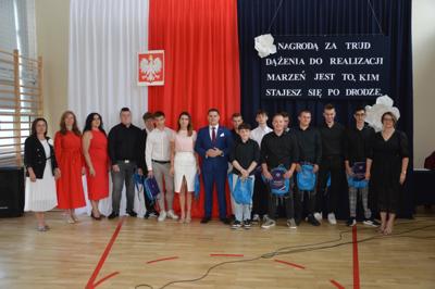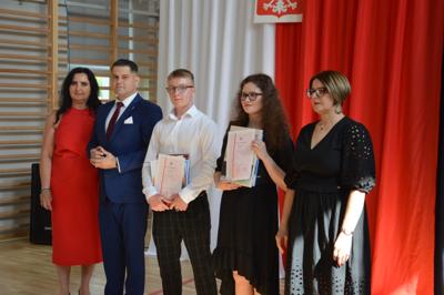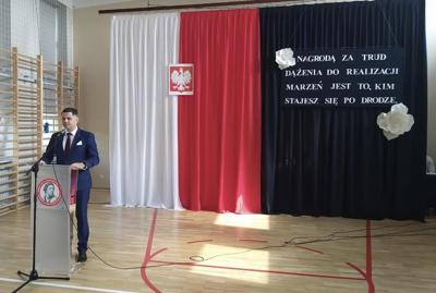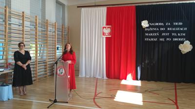 oraz Nauczyciele, Rodzice i cała społeczność szkolna. Pani Dyrektor Ewa Ziółkowska podziękowała nauczycielom, pracownikom administracji i obsługi, rodzicom oraz uczniom za rok wytężonej pracy i wręczyła wraz z Burmistrzem Kamieńska nagrody za wyniki w nauce oraz listy gratulacyjne dla rodziców. Pan Jarosław Bąkowicz - Burmistrz Kamieńska w swoim przemówieniu podkreślił wagę edukacji, zaangażowania nauczycieli oraz wysiłku uczniów. Zwrócił uwagę na rozwój młodzieży jako inwestycję w przyszłość naszej gminy, życząc wszystkim uczniom bezpiecznych i pełnych radości wakacji.