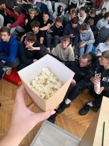 👉 Nie mogło zabraknąć też seansu w naszym szkolnym kinie z popcornem 🍿 – oczywiście w języku angielskim! 🎬