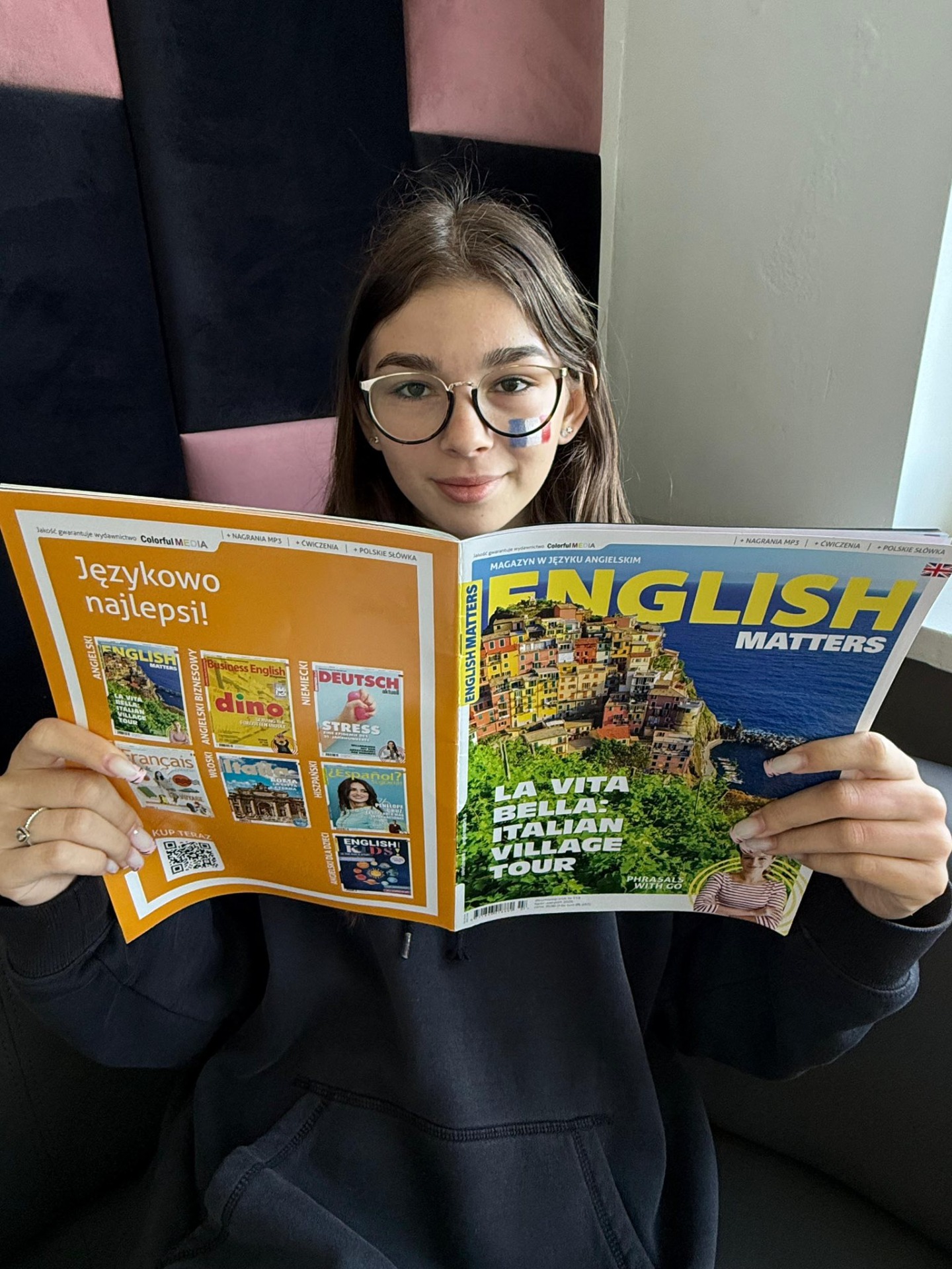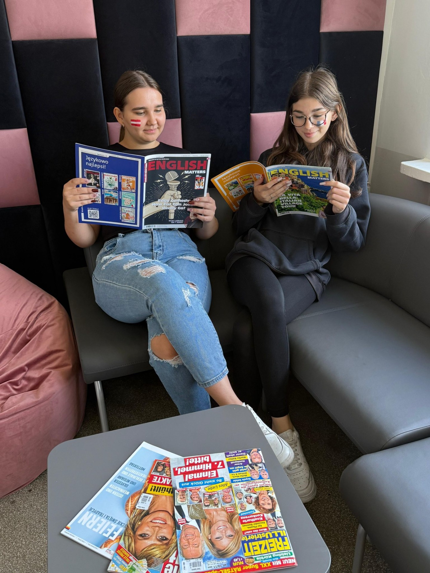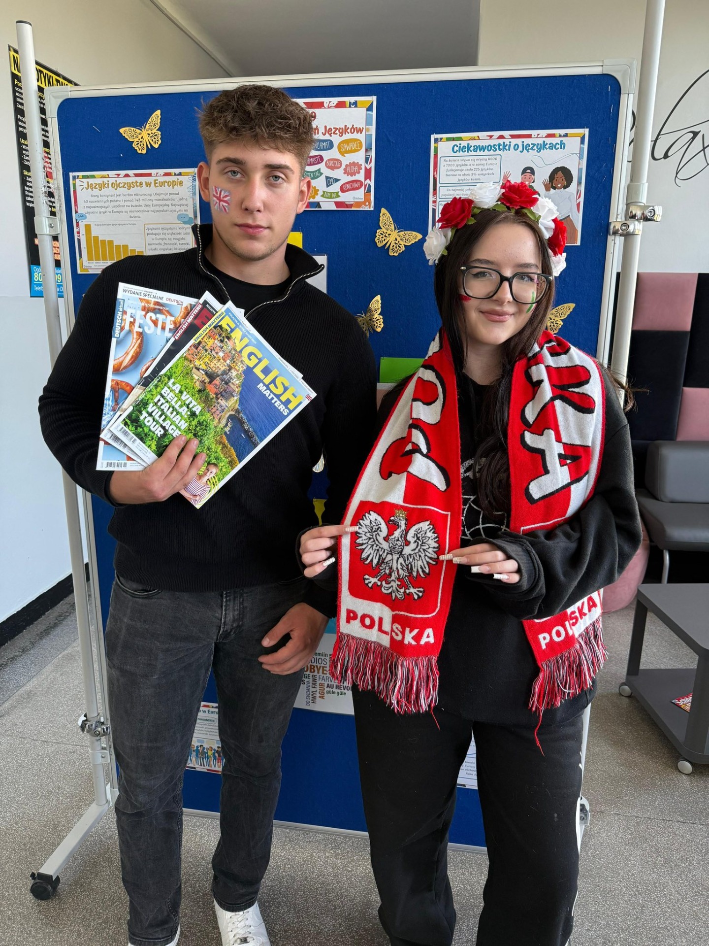 👉 Na korytarzach pojawiła się gazetka i czasopisma w języku angielskim i niemieckim, a twarze uczniów zdobiły malowane flagi 🎨