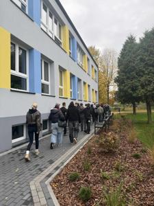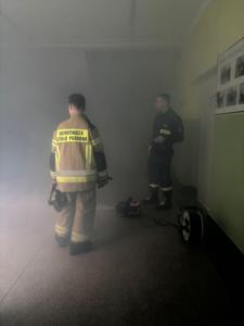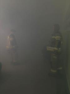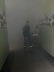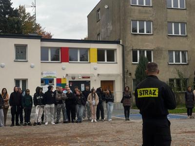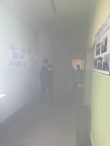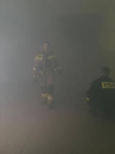 Ewakuacja rozpoczęła się po usłyszeniu 🛎pięciu dzwonków, które są sygnałem alarmowym informującym o konieczności natychmiastowego opuszczenia budynku. Chwilę później na korytarzach pojawił się gęsty, sztuczny dym (nieszkodliwy dla zdrowia), który został użyty celowo, aby jak najwierniej oddać warunki panujące podczas rzeczywistego pożaru, gdy widoczność jest mocno ograniczona.