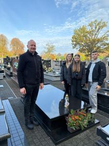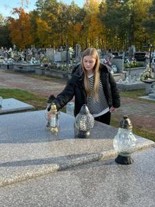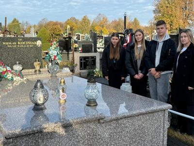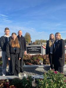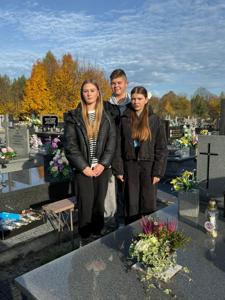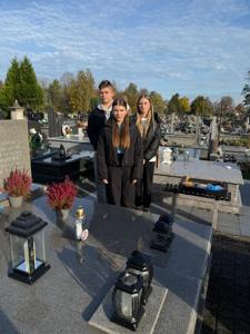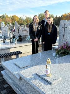 Co roku, przed Uroczystością Wszystkich Świętych, odwiedzamy groby zmarłych dyrektorów, nauczycieli, pracowników obsługi oraz żołnierzy poległych w obronie naszej Ojczyzny, spoczywających na cmentarzu w Kamieńsku. W dniu 23 października 2025 roku przedstawiciele Samorządu Uczniowskiego - Wiktor Sztuk, Maja Kopcik i Lena Madejczyk wraz z opiekunami: p. Renatą Trzepańską i ks. Pawłem Bilem, udali się na cmentarz w Kamieńsku, aby oddać cześć naszym drogim zmarłym. Tam zapalili znicze na grobach zmarłych dyrektorów i nauczycieli: śp. Wiesława Kociniaka, Longina Antoszczyka, Janiny Kozik, Aliny Bartczak, Henryka Strzeleckiego i Mirosława Krężlika.