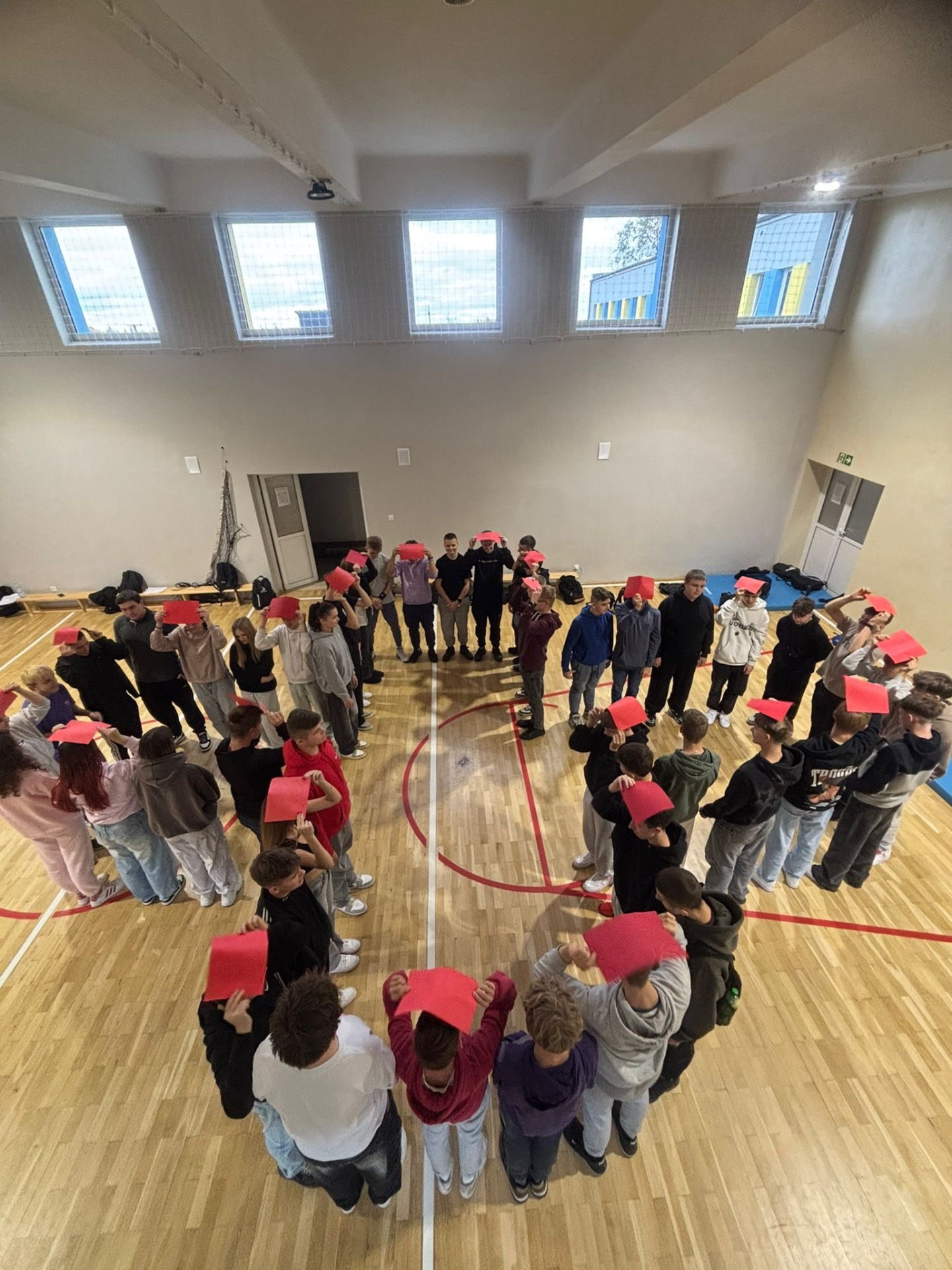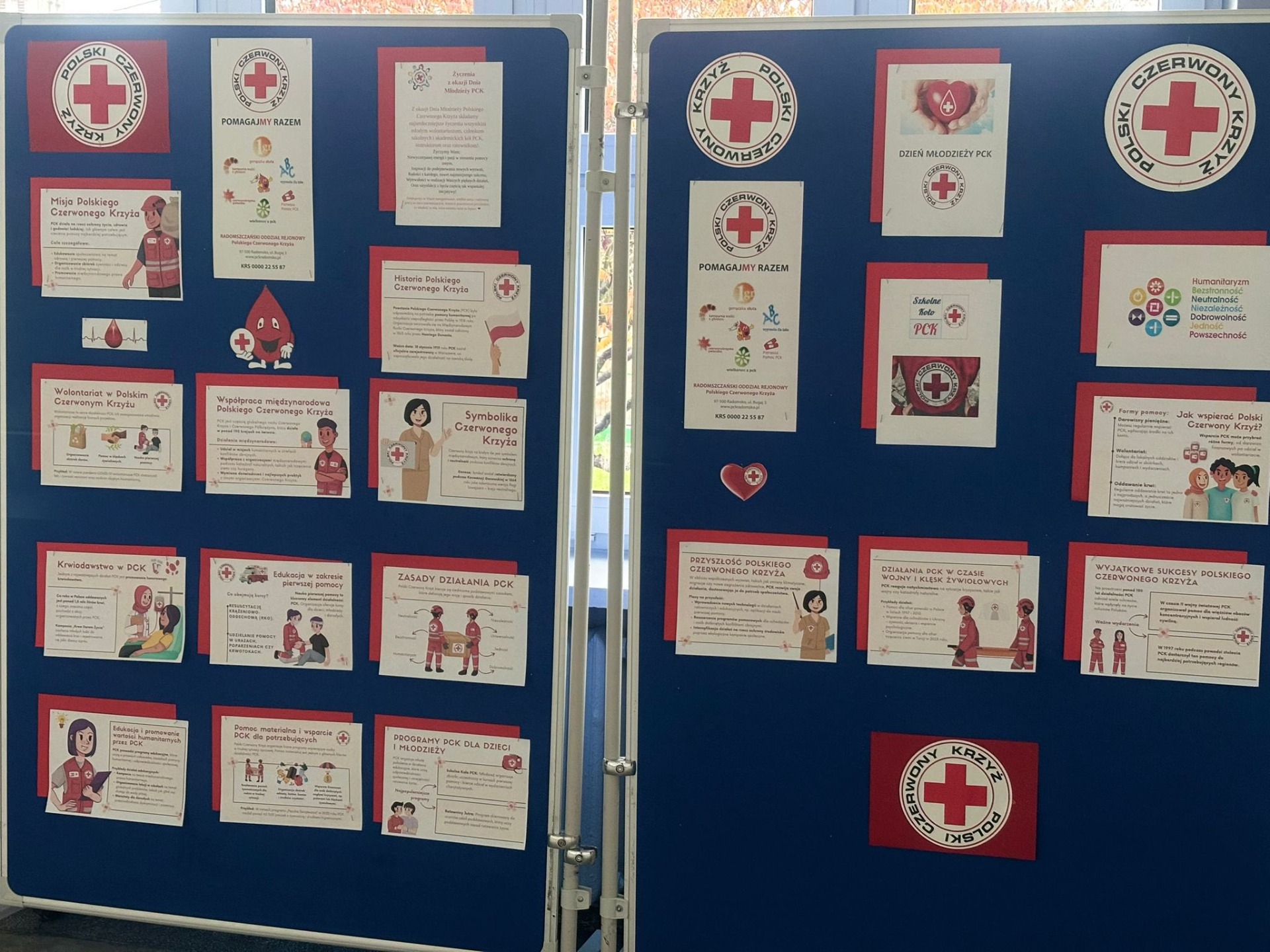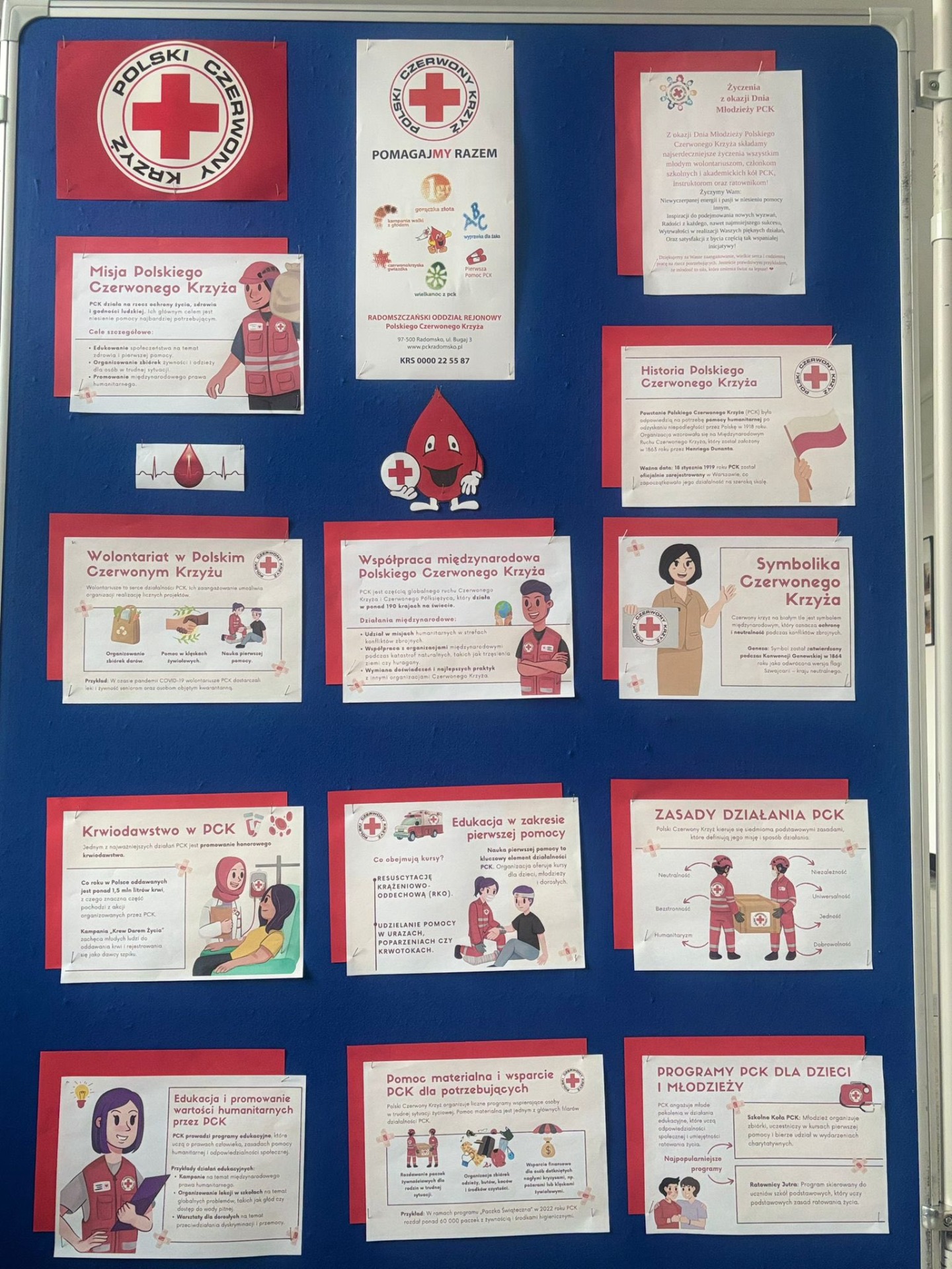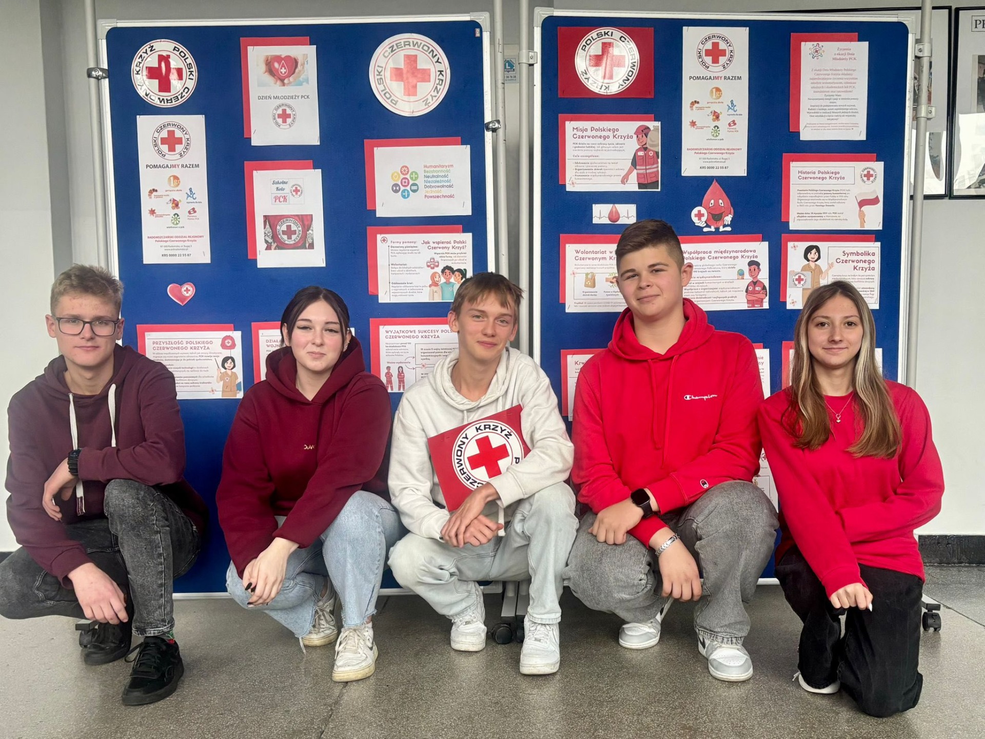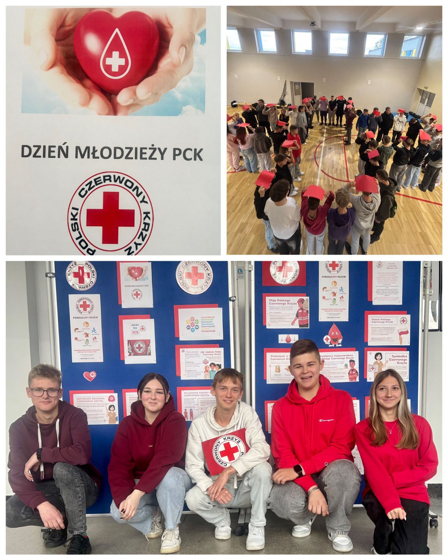 Dnia 27 października w naszej szkole obchodziliśmy Dzień Młodzieży Polskiego Czerwonego Krzyża – wyjątkowe święto młodych ludzi, którzy z zaangażowaniem i sercem działają na rzecz innych. Z tej okazji uczniowie należący do szkolnego koła PCK przygotowali szereg działań promujących ideę tej organizacji. W szkolnym holu powstała okolicznościowa gazetka, która przybliżała historię i misję Polskiego Czerwonego Krzyża oraz prezentowała wartości, na których opiera się jego działalność: humanitaryzm, pomoc potrzebującym, bezinteresowność i solidarność. Nie zabrakło też symbolicznego akcentu – „żywego krzyża”, w którym młodzież stworzyła znak PCK podkreślając w ten sposób jedność i wspólne zaangażowanie w niesienie pomocy. Podczas krótkich prezentacji przypomniano, jak ważną rolę pełni PCK w codziennym życiu – od edukacji prozdrowotnej i promocji krwiodawstwa, po działania wolontariackie i pomoc humanitarną.