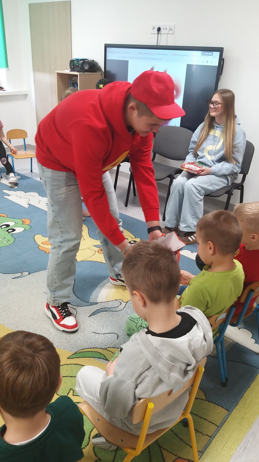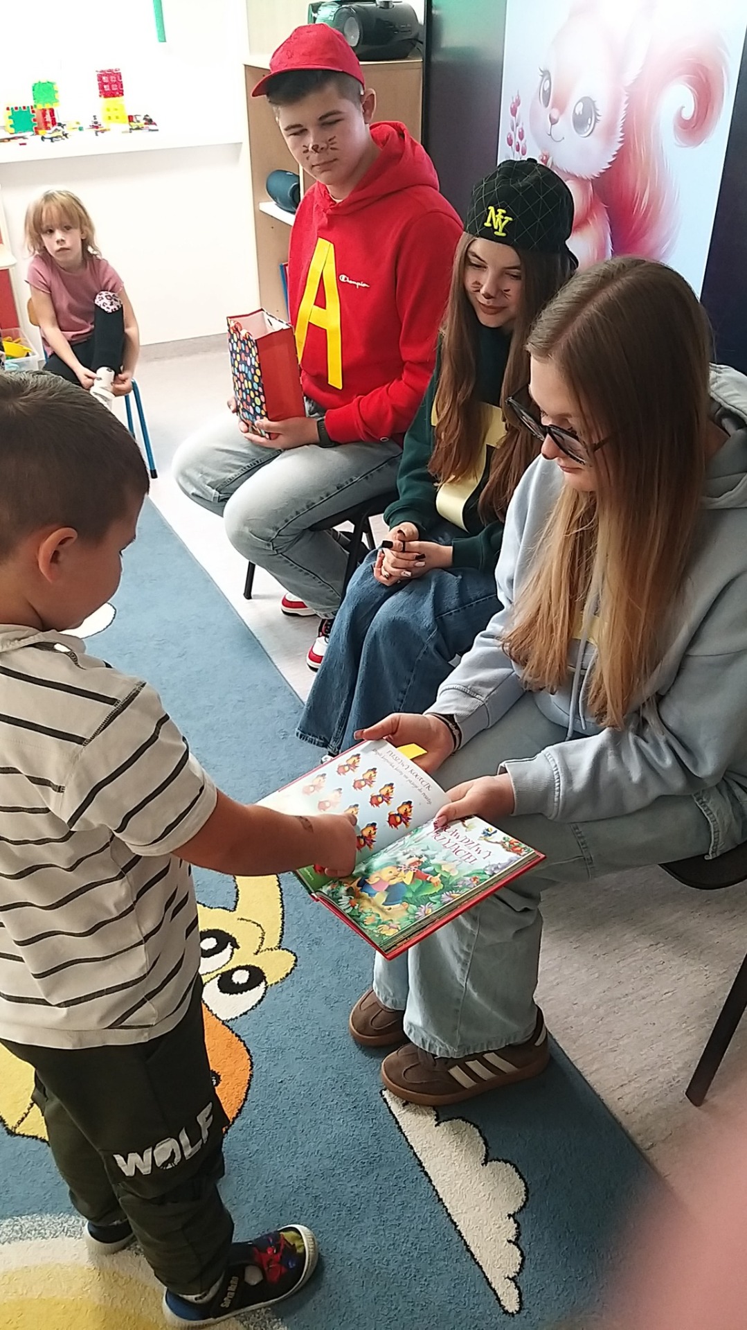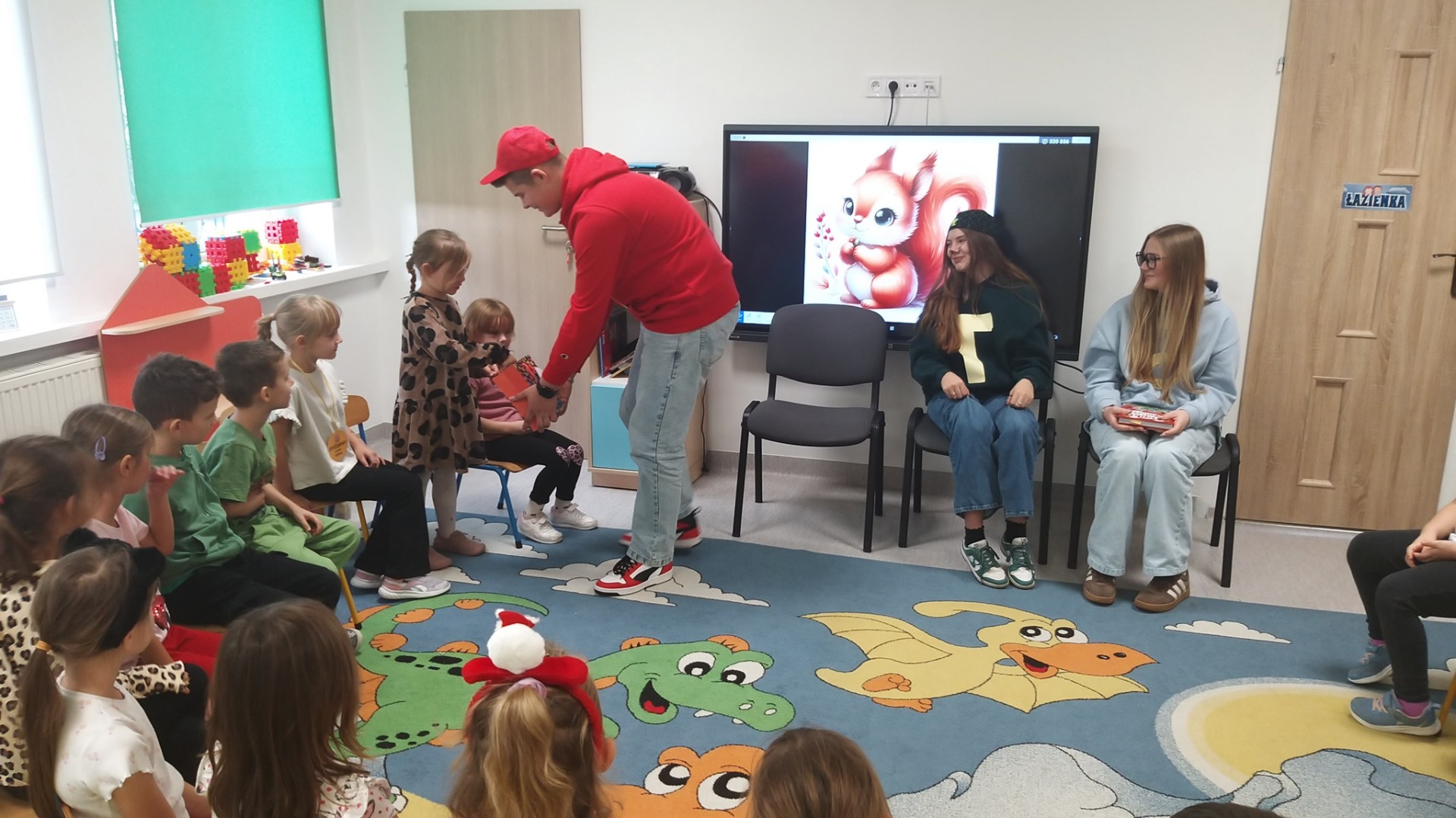 Podczas wydarzenia uczniowie przeczytali dwie bajki: „Wiewióreczka”🐿️📘 i „Kogucik”🐓📙. Dzieci nie tylko słuchały z zaciekawieniem, lecz także aktywnie uczestniczyły w zajęciach – odpowiadały na pytania dotyczące treści, wykonywały zadania, szukały po śladzie, znajdowały różnice w obrazkach oraz liczyły elementy na ilustracjach. 🔍✏️🧮 Na zakończenie dla przedszkolaków czekała niespodzianka – każdy otrzymał mały, słodki upominek. 🍬😊