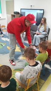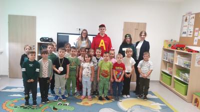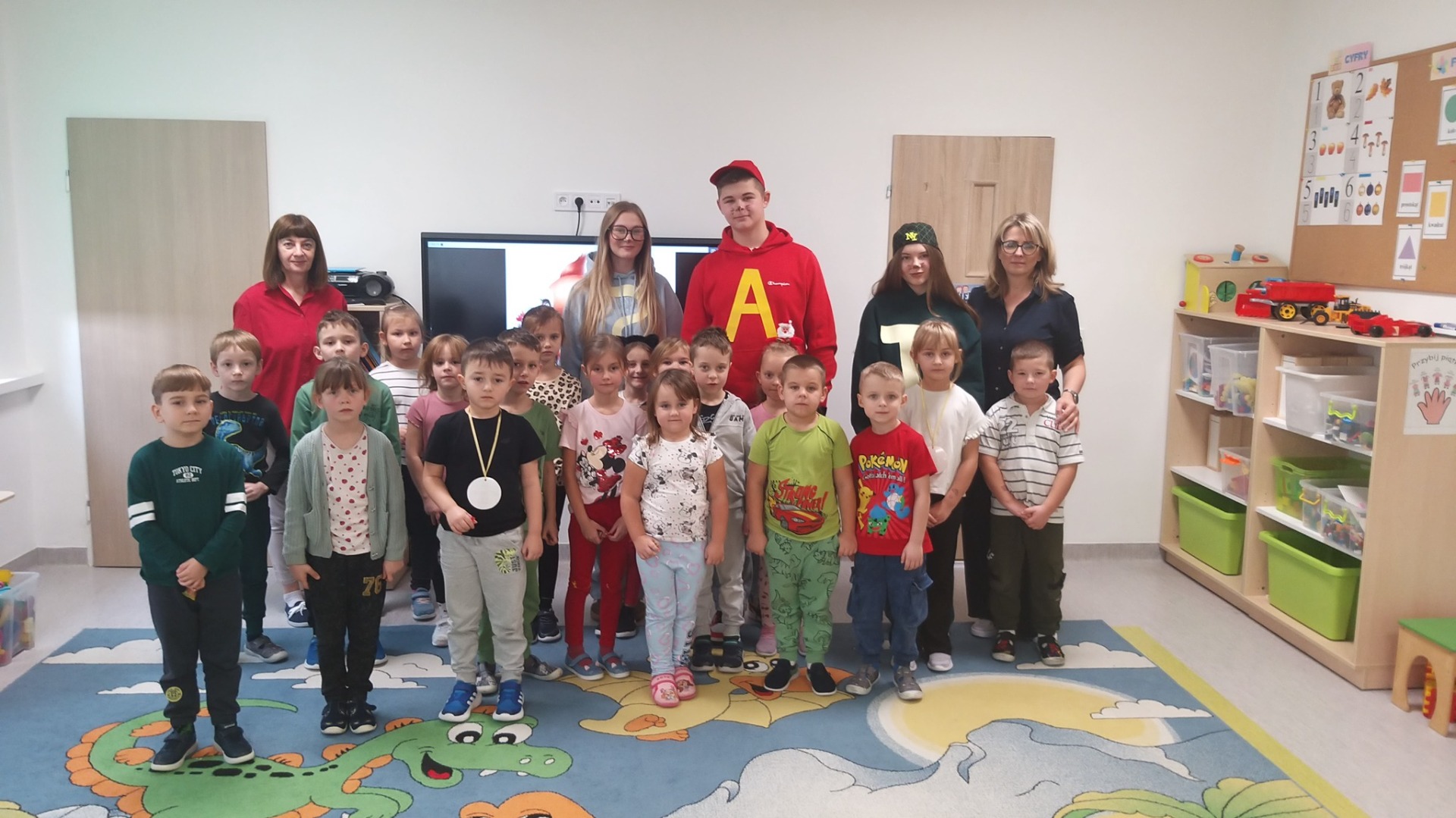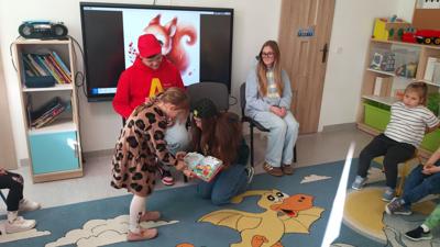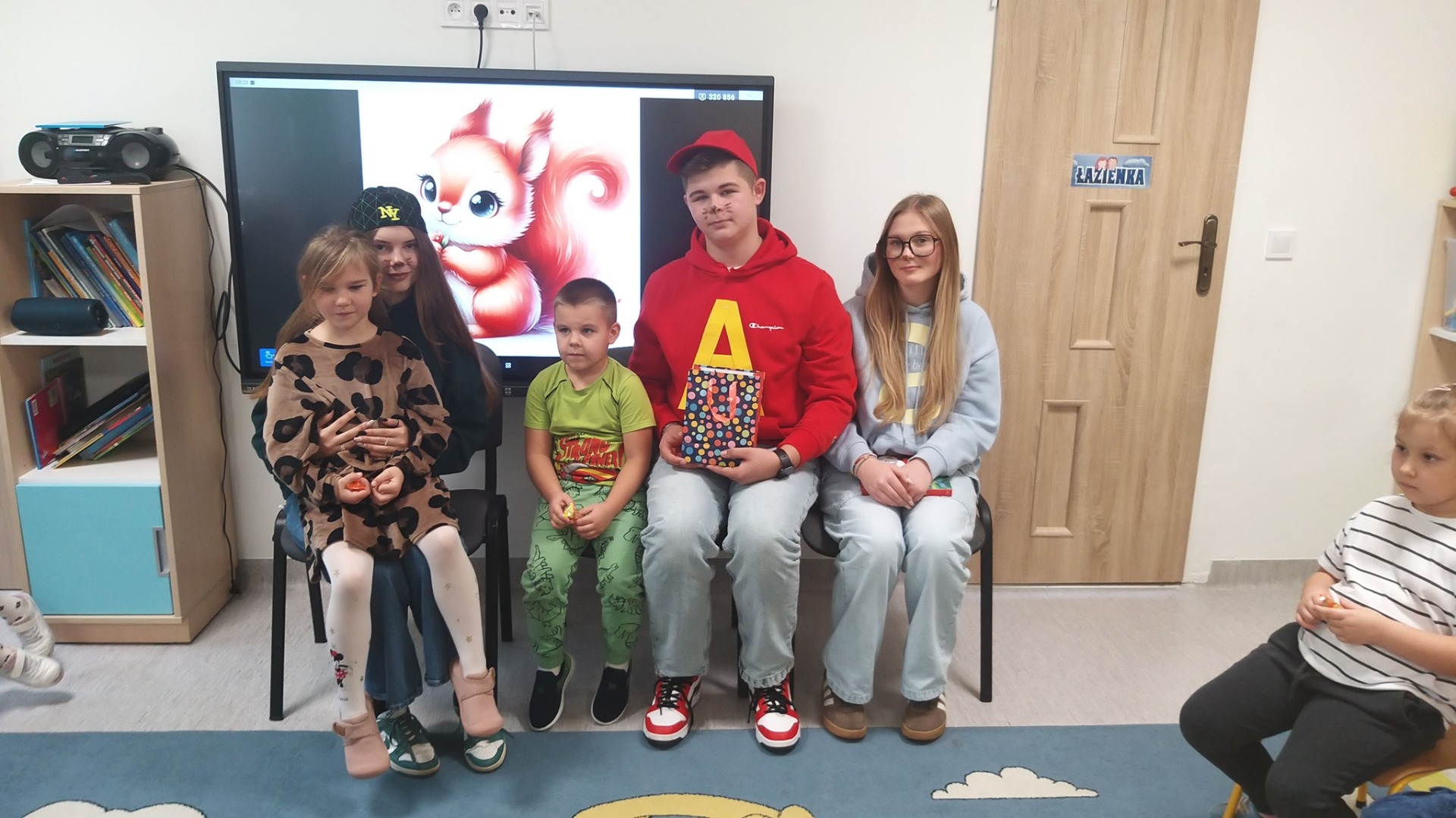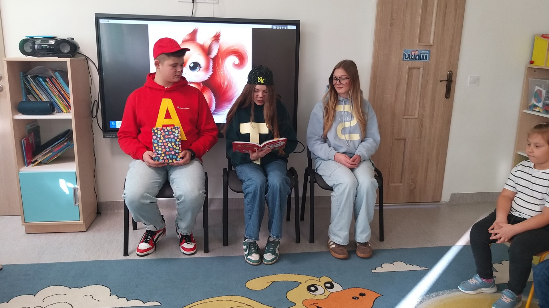 Podczas wydarzenia uczniowie przeczytali dwie bajki: „Wiewióreczka”🐿️📘 i „Kogucik”🐓📙. Dzieci nie tylko słuchały z zaciekawieniem, lecz także aktywnie uczestniczyły w zajęciach – odpowiadały na pytania dotyczące treści, wykonywały zadania, szukały po śladzie, znajdowały różnice w obrazkach oraz liczyły elementy na ilustracjach. 🔍✏️🧮 Na zakończenie dla przedszkolaków czekała niespodzianka – każdy otrzymał mały, słodki upominek. 🍬😊