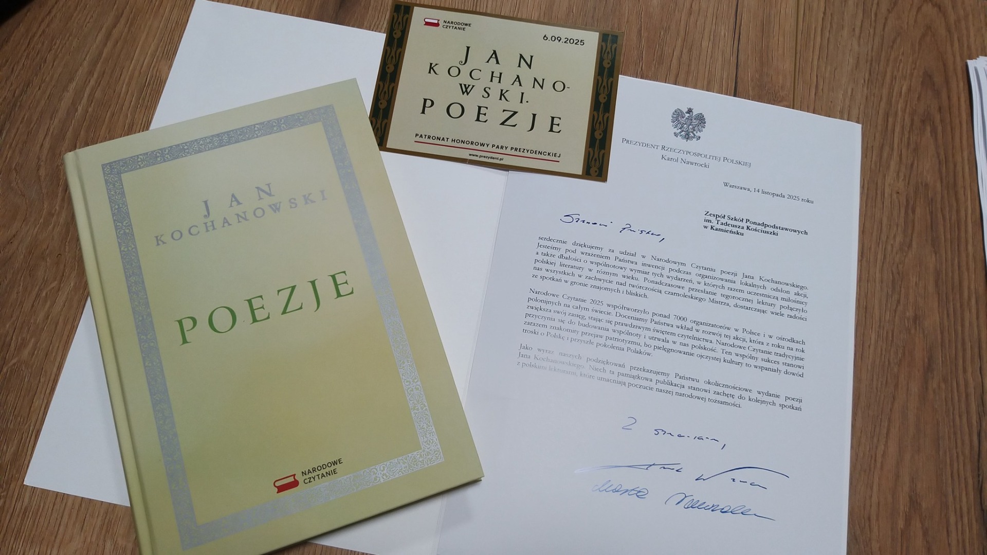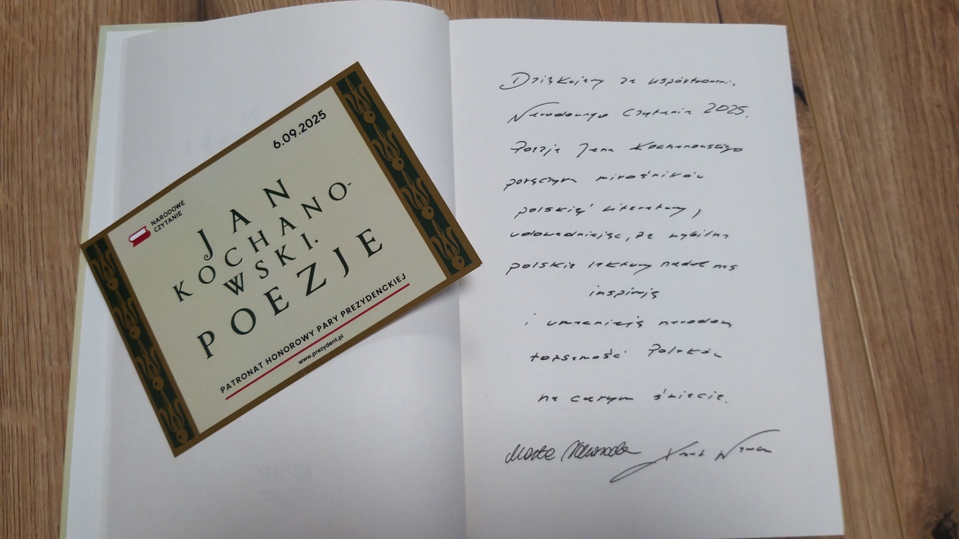 Z radością informujemy, że w ramach tegorocznej edycji Narodowego Czytania nasza szkoła otrzymała od Pary Prezydenckiej wyjątkową pamiątkę, pięknie wydaną książkę zawierającą poezję Jana Kochanowskiego, patrona polskiej literatury renesansowej. Publikacja została opatrzona okolicznościowym listem oraz pamiątkową dedykacją, które z dumą dołączą do szkolnych zbiorów. Dziękujemy wszystkim, którzy wzięli udział w wydarzeniu i współtworzyli jego wyjątkową atmosferę. 📚