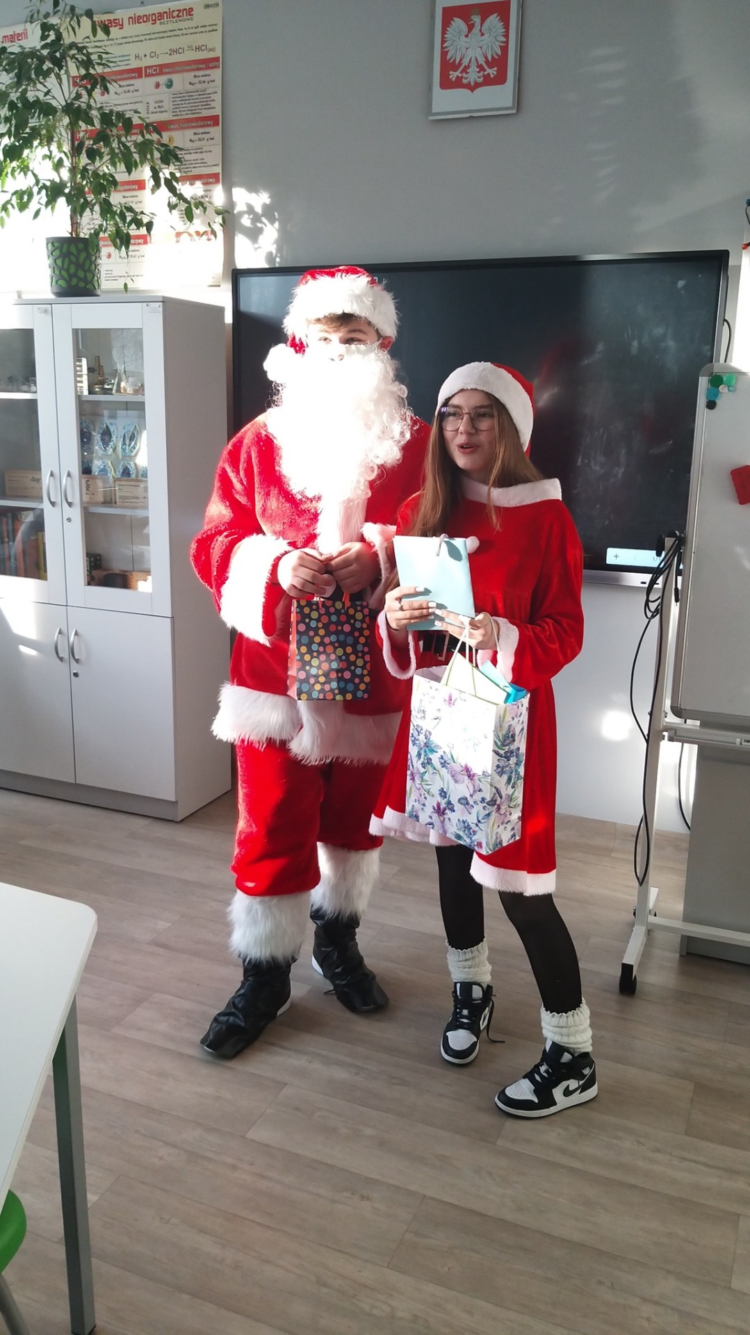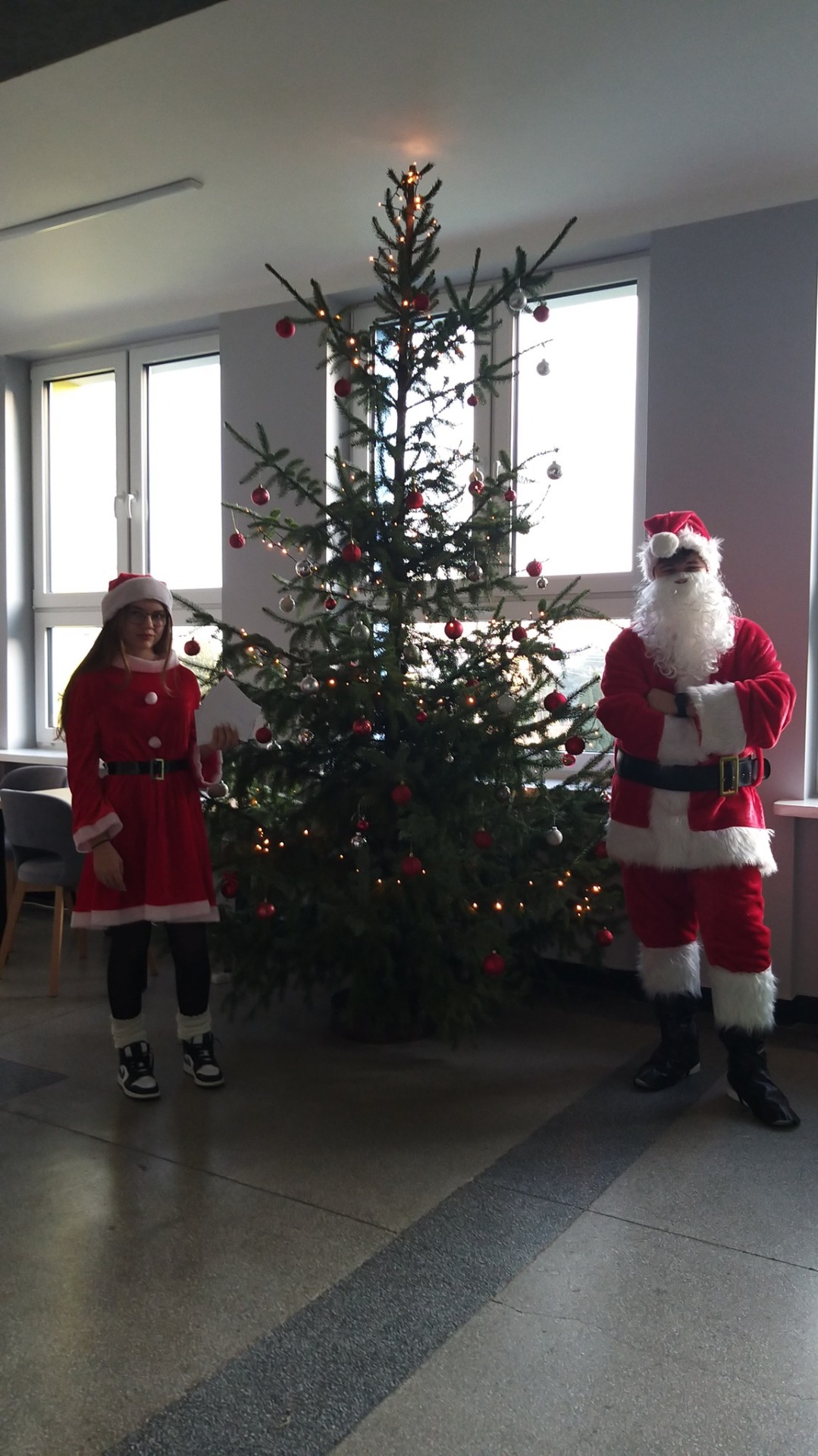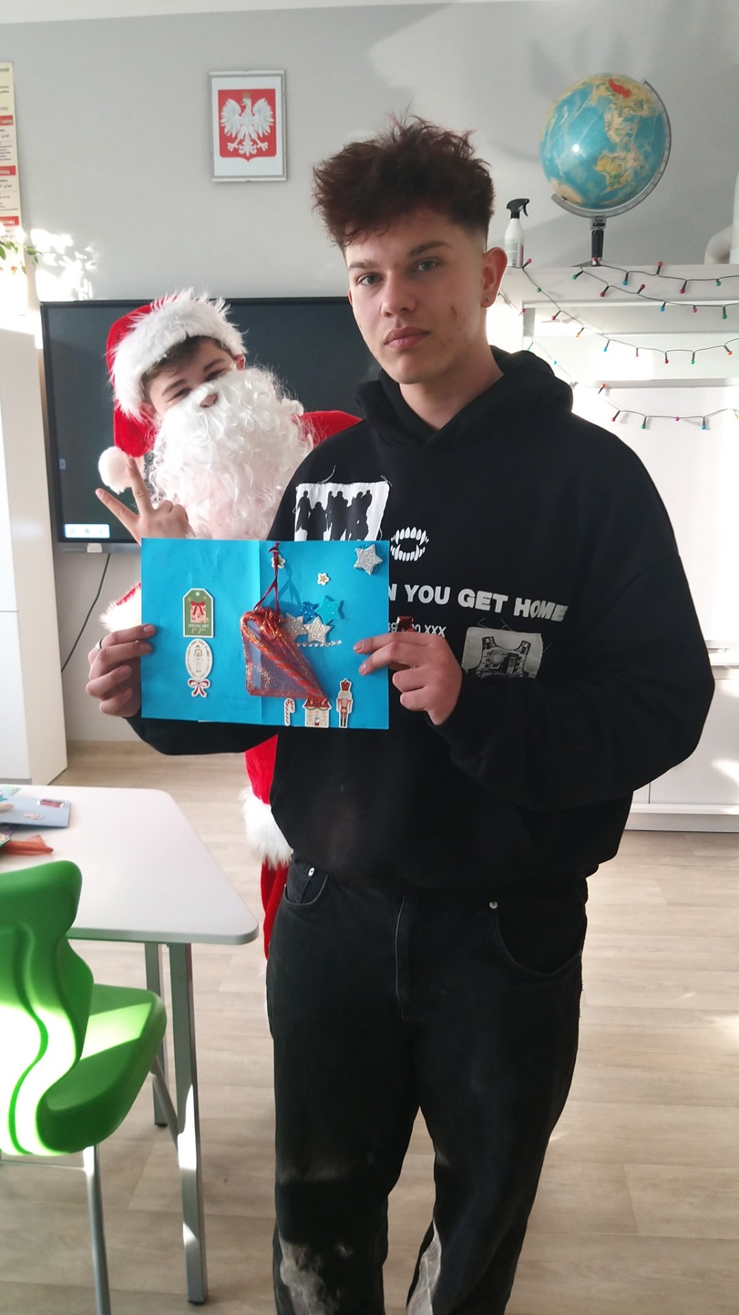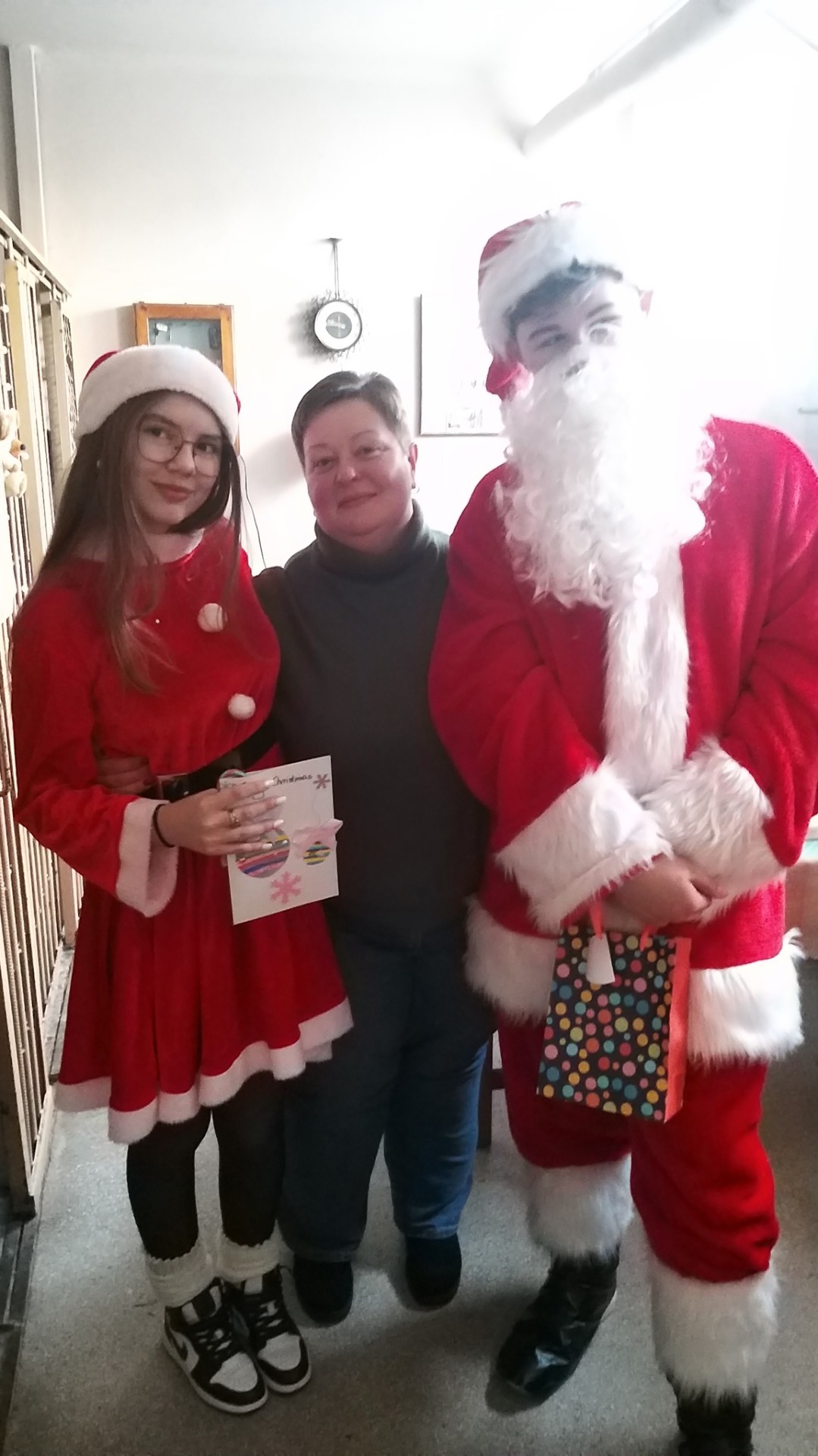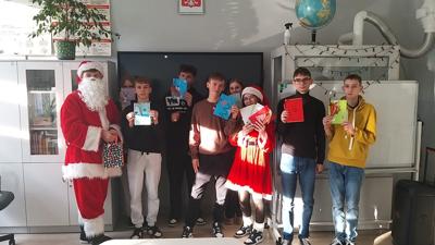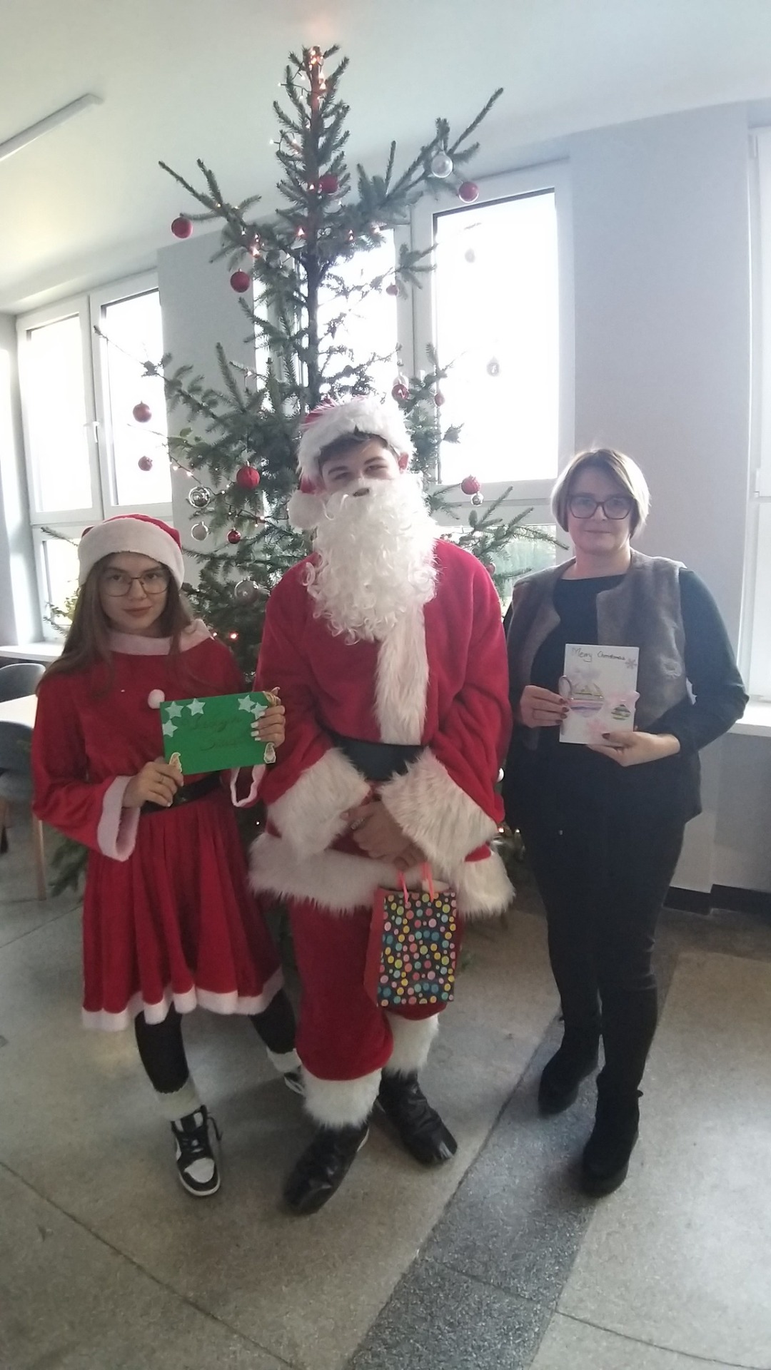 Licealiści, przebrani za Mikołaja i Śnieżynkę 🎅❄️, wręczali młodszym uczniom kartki oraz słodkości, wprowadzając wszystkich w radosny i świąteczny nastrój. Miłą niespodzianką było również to, że nasi uczniowie otrzymali od trzecioklasistów piękne, własnoręcznie wykonane kartki świąteczne, które były wyrazem wdzięczności, kreatywności i dziecięcej radości. 💌